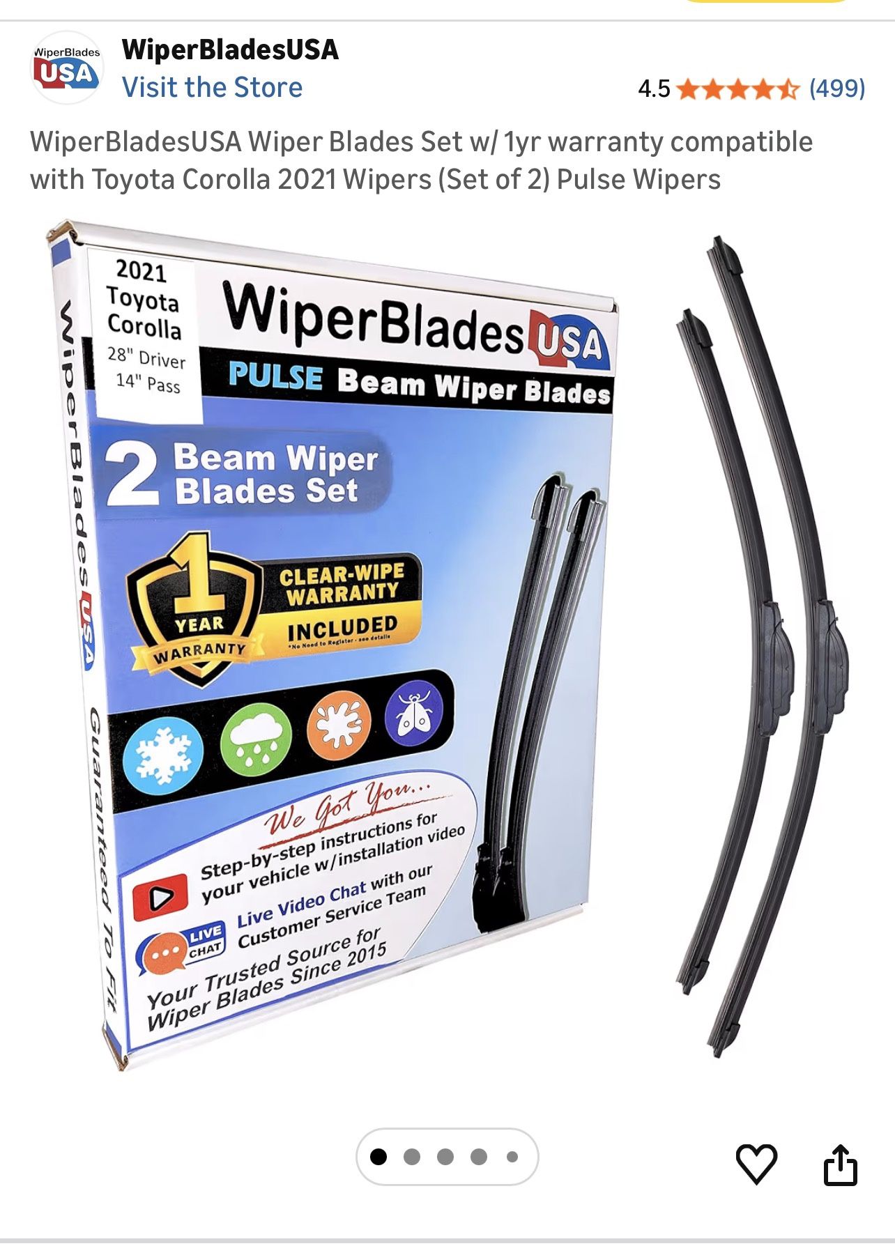This wiper blades set is compatible with Toyota Corolla 2021 It contains a 28" WiperBladesUSA all-weather beam blade for your Driver Side wiper blade + a 14" WiperBladesUSA all-weather beam blade windshield wiper blade for your Passenger Side windshield wiper blade New and still in box