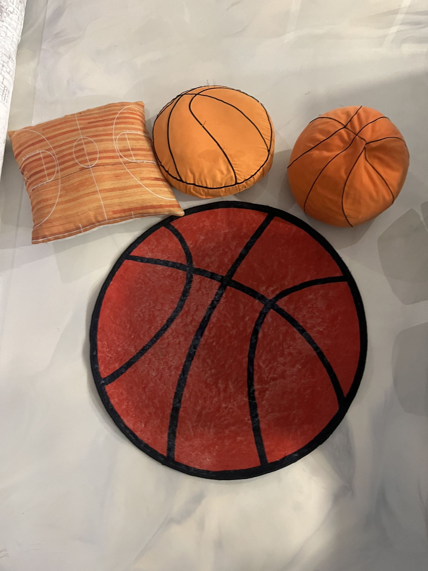 See dimensions in pictures 32” round rug 16x16 square 15” round pillow A round basketball pillow All for $20 Just washed and clean. Ready for pick up