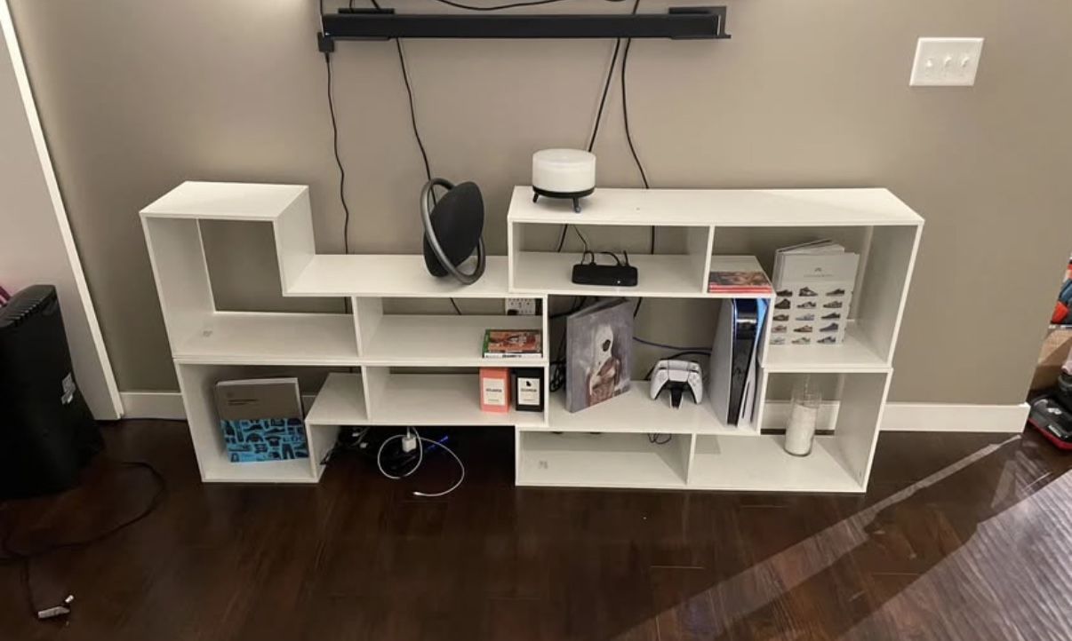 Modern white console TV stand. Super versatile, has a cool geometric design with lots of shelves for storage. Fits TVs up to 50 inches. Dimensions are about 43.1" W x 11.7" D x 15.8" H.