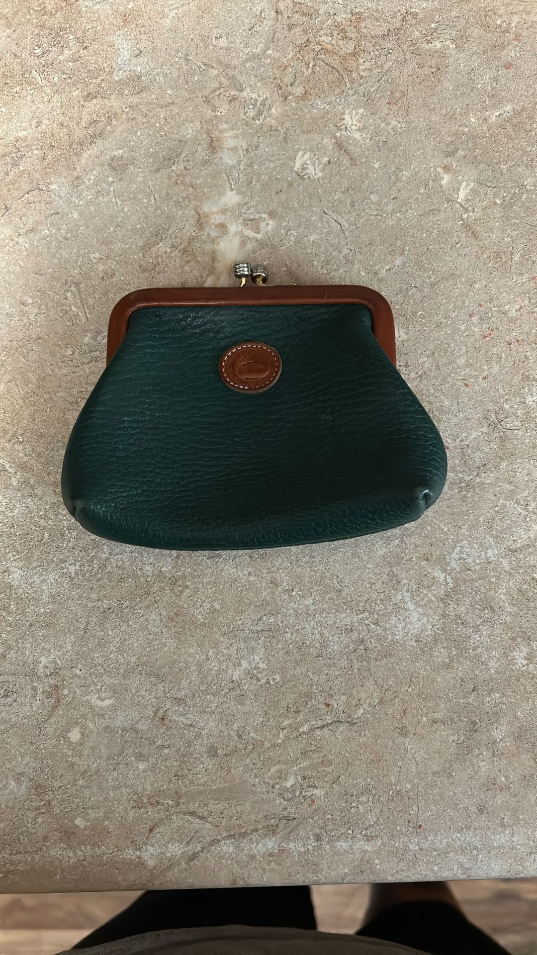 Vintage Dooney and Bourke kiss lock framed Forrest green pebbled leather coin/change purse with British tan trim. Rare very hard to find in mint condition.