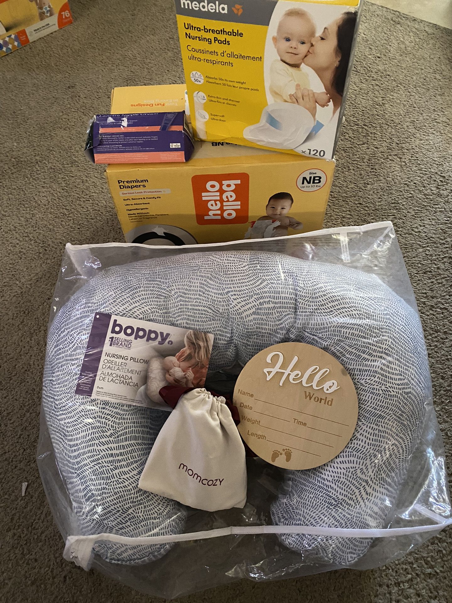 Save big with a bundle! Pick up in Surprise. 303/Waddell. Hello Bello newborn diapers - 72 count Boppy nursing pillow with washable cover Medela nursing pads - 120 count Lansinoh nipple cream Momcozy lactation massager Hello World wooden sign *All items are unused. Outer packaging may be damaged due to shipping. Some items have been removed from packaging