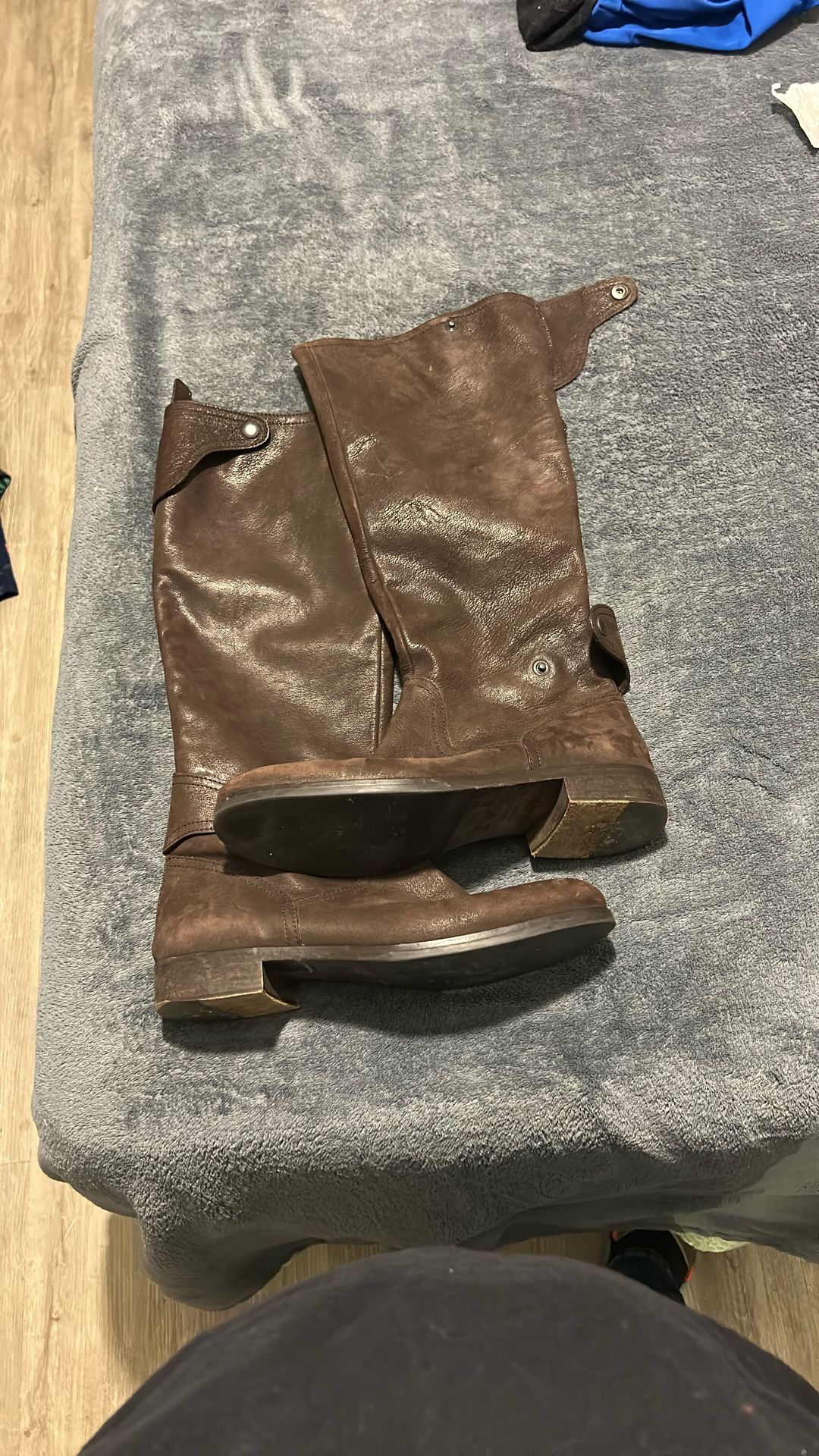 Emporio Armani leather boots, made of genuine Italian leather. The sole features the EA logo, size 38 typically corresponds to US women’s size 7.5 and the stamp VERO CUOIO which is Italian high quality material and craftsmanship, used but in very good condition, in Corona Ca