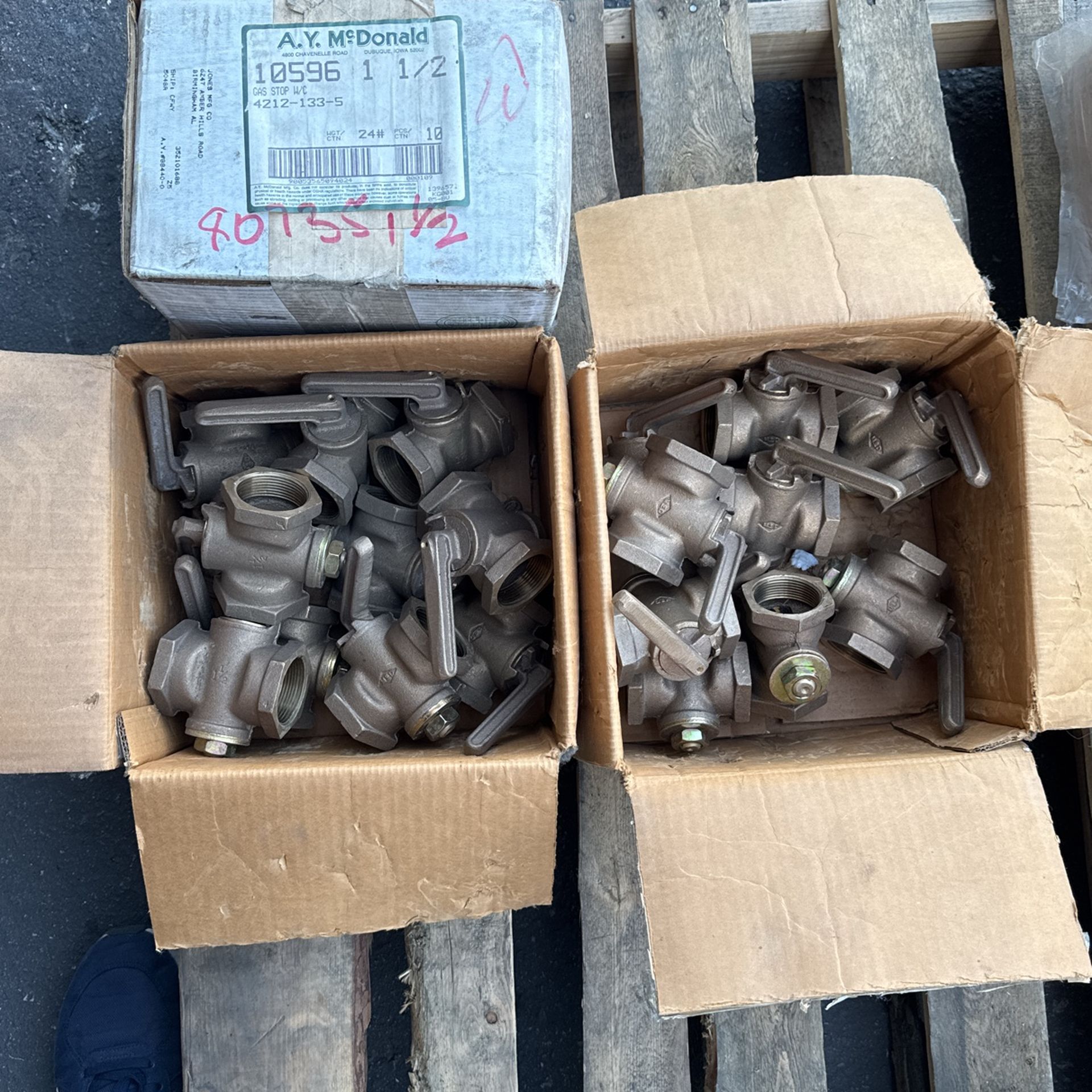 $1000 for the Whole Lot. Qty of 29 - 1-1/2 - A.Y. McDonald Gas Stop Qty of 1 - 2” A.Y. McDonald gate Valve Qty of 1 - 3/4” & 1” Stockham Gate Valve (threaded) Qty of 2 - 1/2” Stockham Gate Valve (threaded) Qty of 6 - Misc swing checks valves 1/2” - 1”