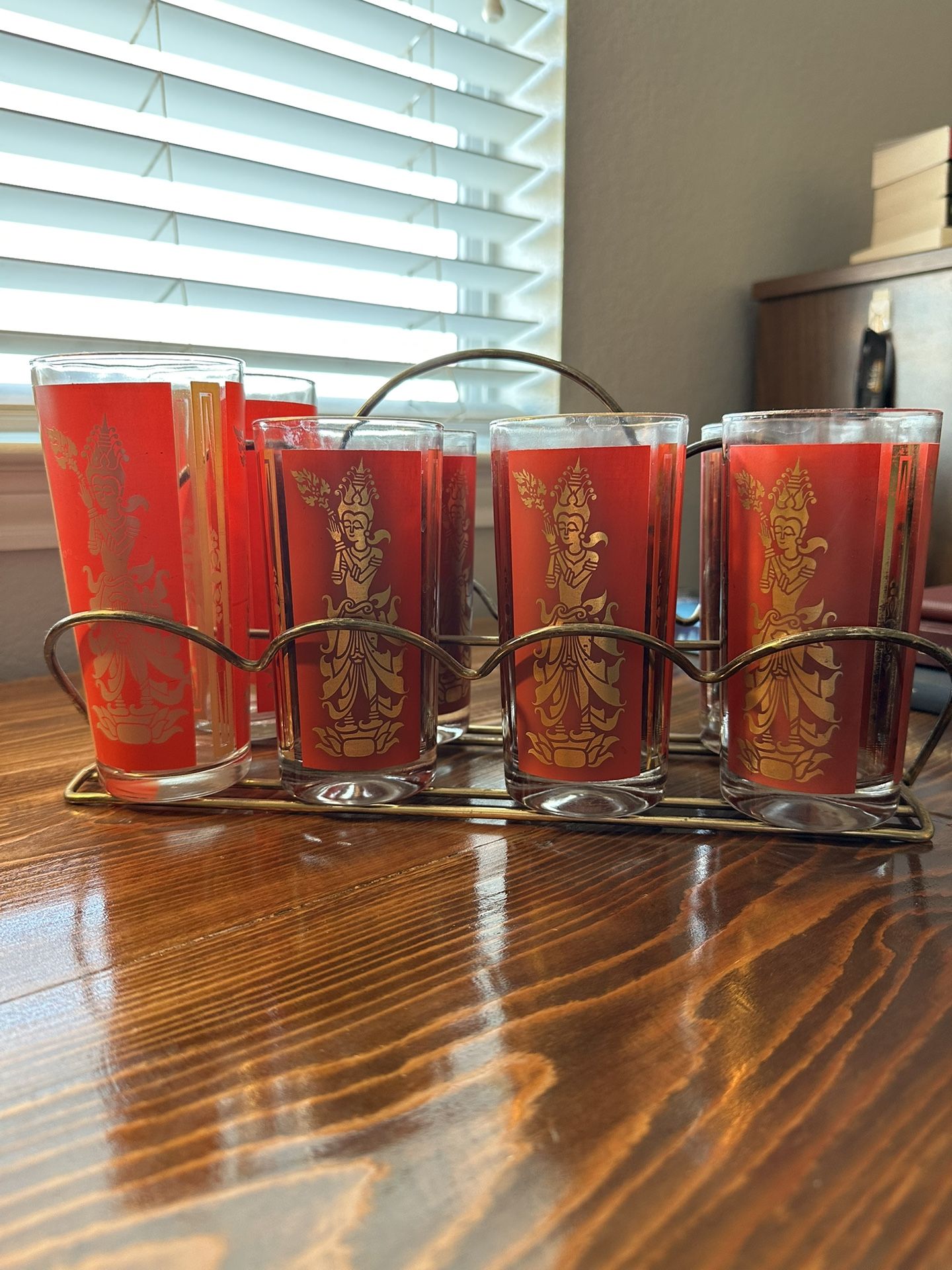 This is a must have set of Mid Century (1960s) barware. It was designed by Culver Glass Co. and has a Thai Goddess painted in gold and surrounded with a bright red border, then trimmed with ornate side panels in 22k gold. It includes a total of 8 glasses, 6 of which are 12 ounce and have the original 22k gold rim and side trimmings, 2 are 16 ounce and have the 22k gold rims, but the sides are a gold colored paint and not the 22k gold as on the rims. Each glass is in great used condition with some light wear to the painted rims, but no chips and no cracks. The brass glass caddy does come with the set. The 12 ounces glasses Measure 5 1/2" tall and the 16 ounce measure 6 1/2" tall.