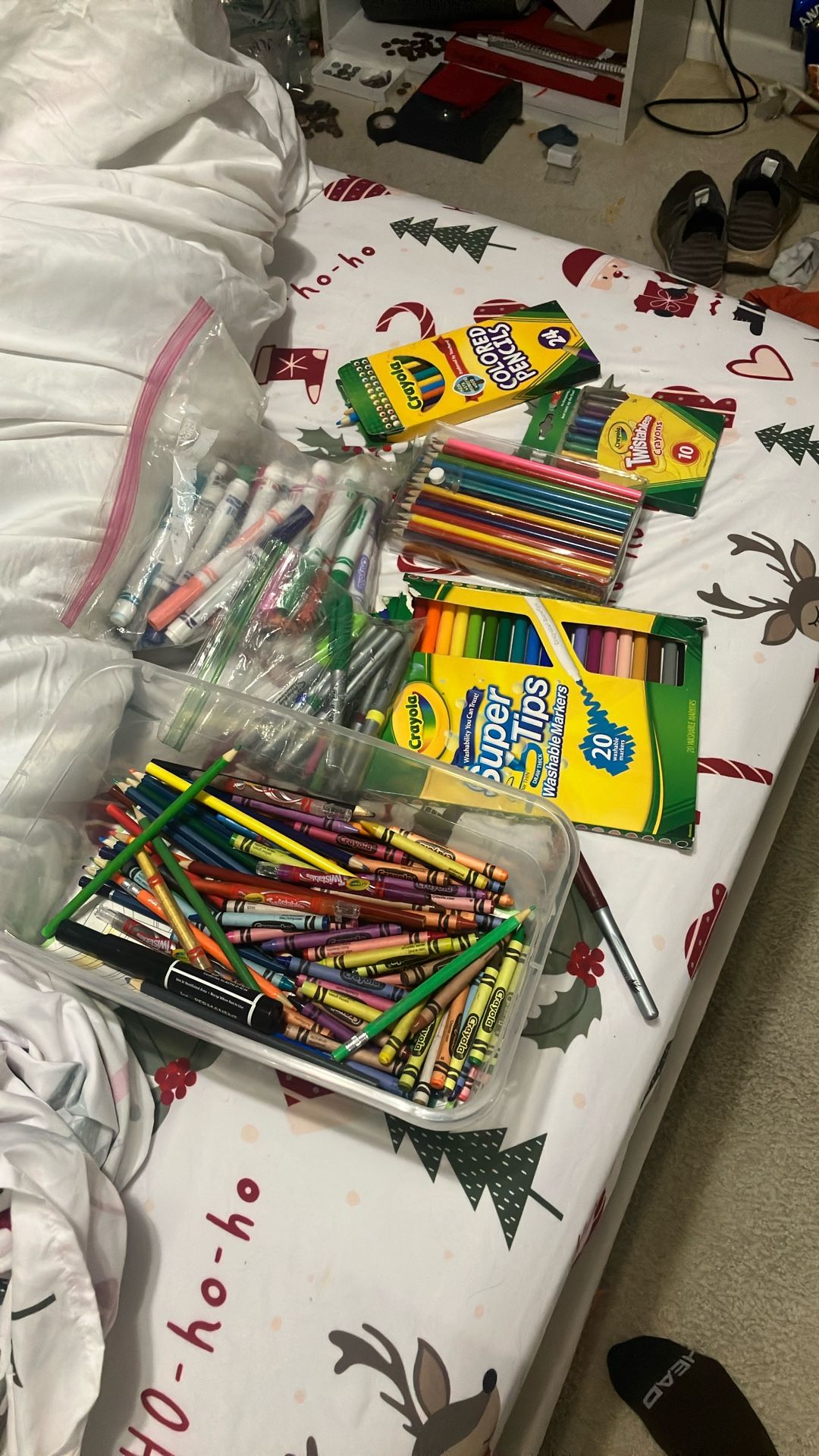 Crayons, markers, color pencils, and permanent markers. Bunch of them. No longer use, thanks 25 obo