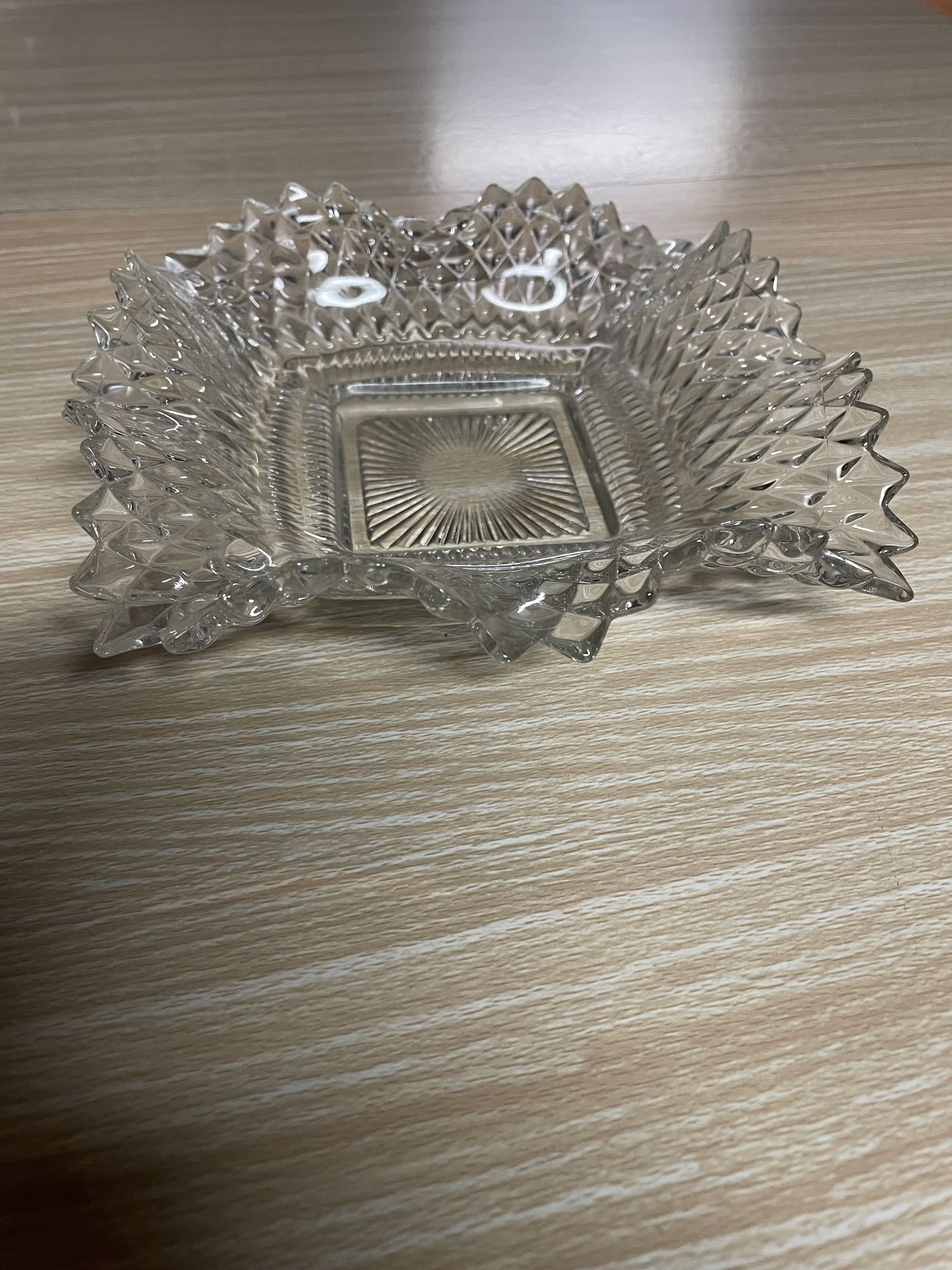 Clear glass candy dish. Has a square shape with a starburst design in the middle. Edges are textured, kind of like a diamond pattern. Great for candy, jewelry, or just as a nice decor piece.