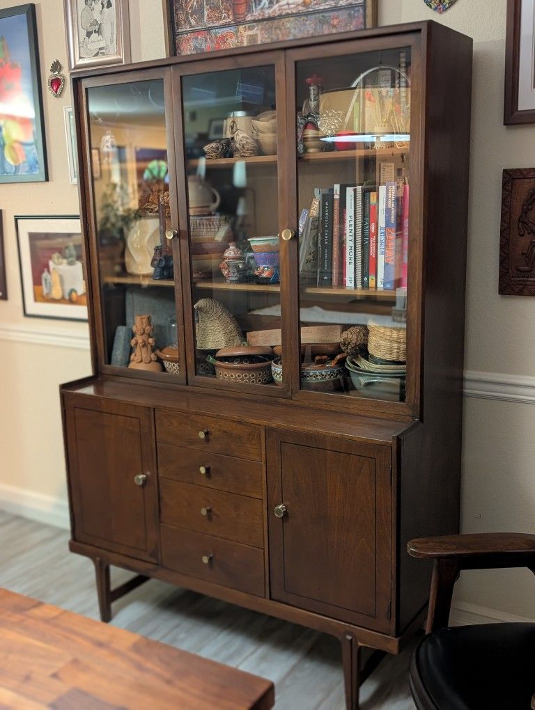 Mid century hutch made out of solid wood in walnut color, brass handles. This is a vintage piece that was given a bit of TLC. Minor scratches can be found but nothing indicates any damage. It has hooks hanging from the top to hang cups. Dimensions: 72" H x 48" W x 20" D
