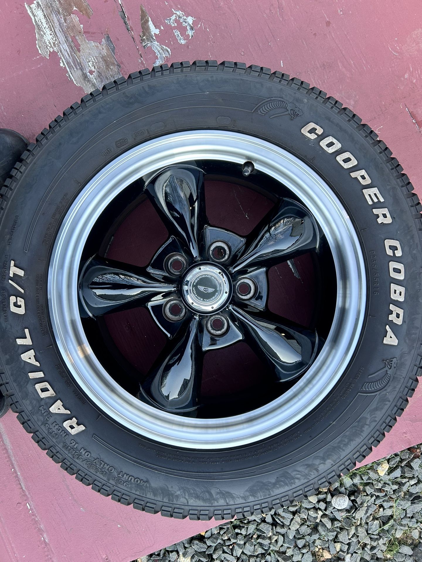 “Torq thrust M” model American racing rims Finish gloss BLACK W/ MACHINED LIP really good condition. I took care of them and switched only to have a wider tire. 16 inch diameter 35mm offset , 7 inch wide, 5 x 114.3 bolt pattern off a ford mustang. Comes with 4 cooper cobra 235/55/16 tires. The tires are mounted on the rims that still have good tread and about half life used at around 25000 miles. Cash only