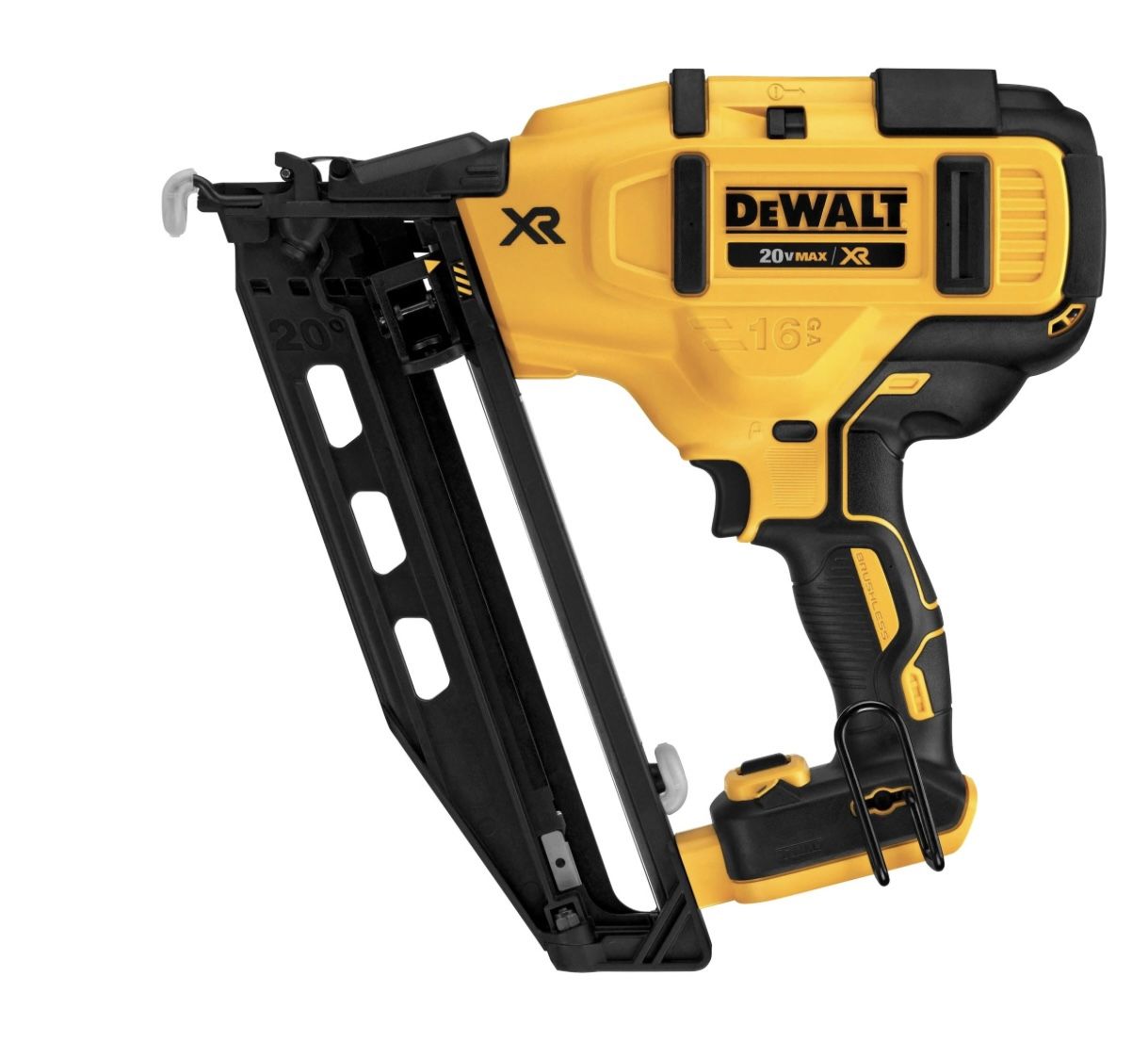 The DEWALT DCN660 16 Gauge Angled Finish Nailer drives 16 Gauge angled finish nails from 1-1/4" to 2-1/2" which makes it ideal for fastening crown molding, casing, and baseboards. With its brushless motor powered by a DEWALT 20V MAX* Lithium-Ion battery the DCN660 is ready to go to work without the hassle of using gas, compressor, and hose. Tackle jobs both large and small with the features of a pneumatic tool and the freedom of cordless. * - Maximum initial battery voltage (measured without a workload) is 20 volts. Nominal voltage is 18. Details & Features 100% battery powered. Eliminates the hassle of using gas, compressor, and hose Brushless motor maximizes runtime and durability Tool-free selectable trigger for sequential or contact actuation modes Tool-free depth adjustment for precise countersinking of nails Tool-free jam release to quickly and easily clear nail jams Multi-functional LED lights help to provide both workspace illumination and tool diagnostics