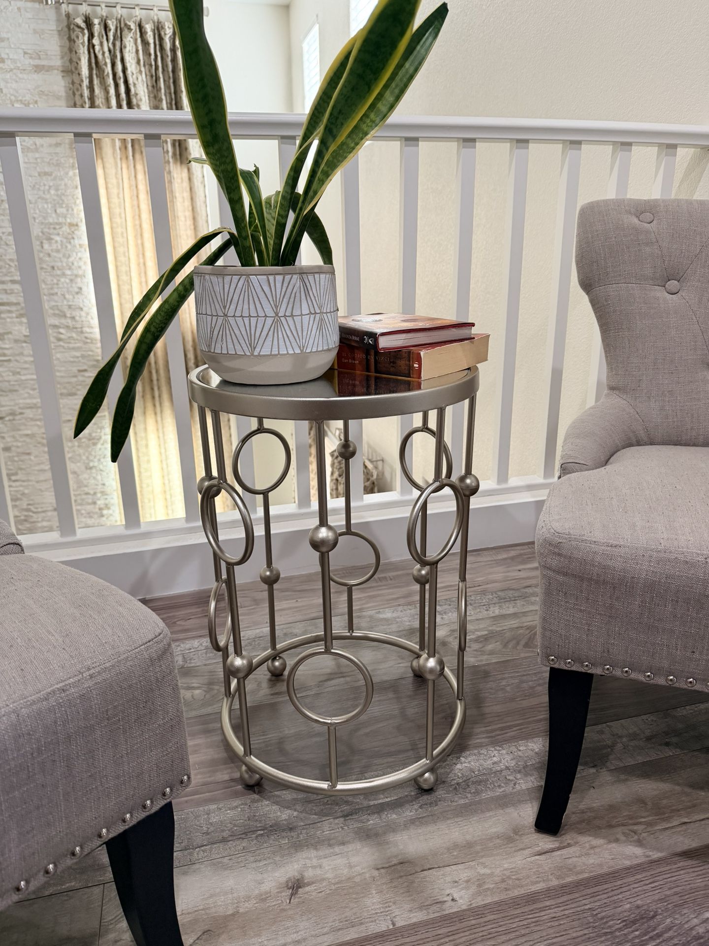 Brushed nickel finish with mirror as the top of table It is 23 in tall and 15 in wide Also selling chairs that are pictured in third photo on a separate posting