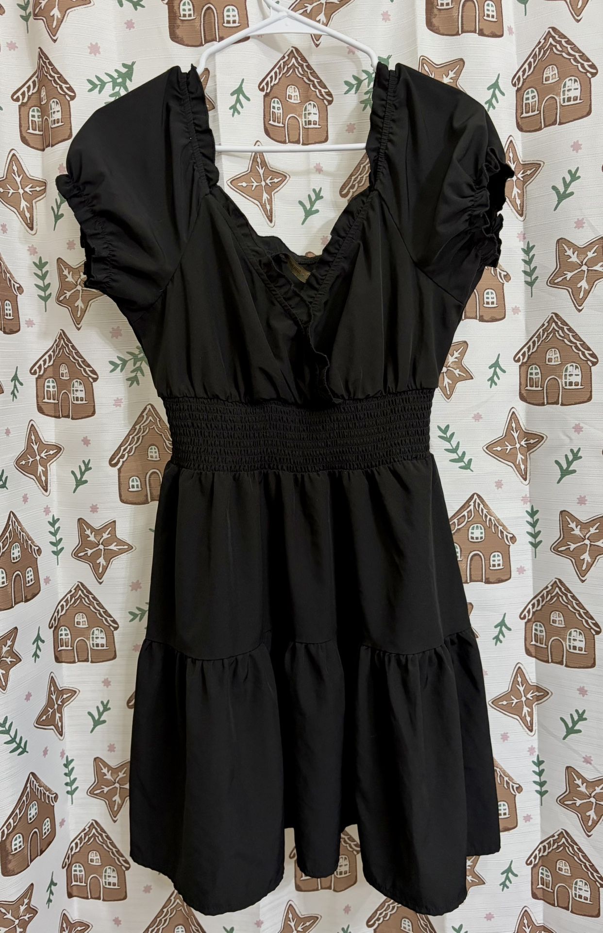 Black dress with smocked waist and ruffled sleeves. Has a V-neckline and short sleeves. The dress is made of a lightweight material and has a flowy skirt. Size L. Pickup escondido ca 92026, can deliver locally for $$ extra M-F same/ next day shipping available
