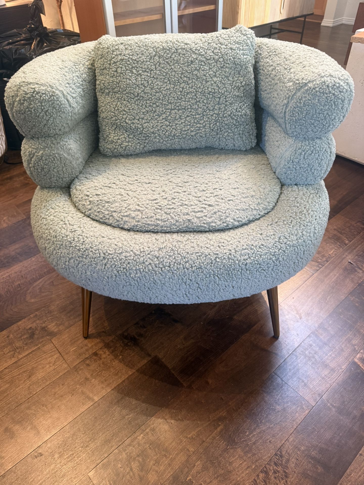 Upholstered Accent Barrel Chair with Metal Base. Like new. Barely used. Purchased for $400+ Details: This chair boasts timeless comfort and inviting coziness with its soft seat and comfortable polyester fabric filled with high-quality, soft foam. Suitable for any space, this chic design barrel chair adds a pop of style to your living room, bedroom, or home office. Contemporary style with unique backrest design suitable for all kinds of decor. Plus, it comes with a small PP cotton toss pillow for extra comfort. Weights & Dimensions: Item Size: 30.7"W x 28"D x 27"H Seat Size: 19"W x 22"D x 16.5-18.5"H Back Height to Seat: 9.5"H Item Weight: 30.40 lb Leg Height: 10"H