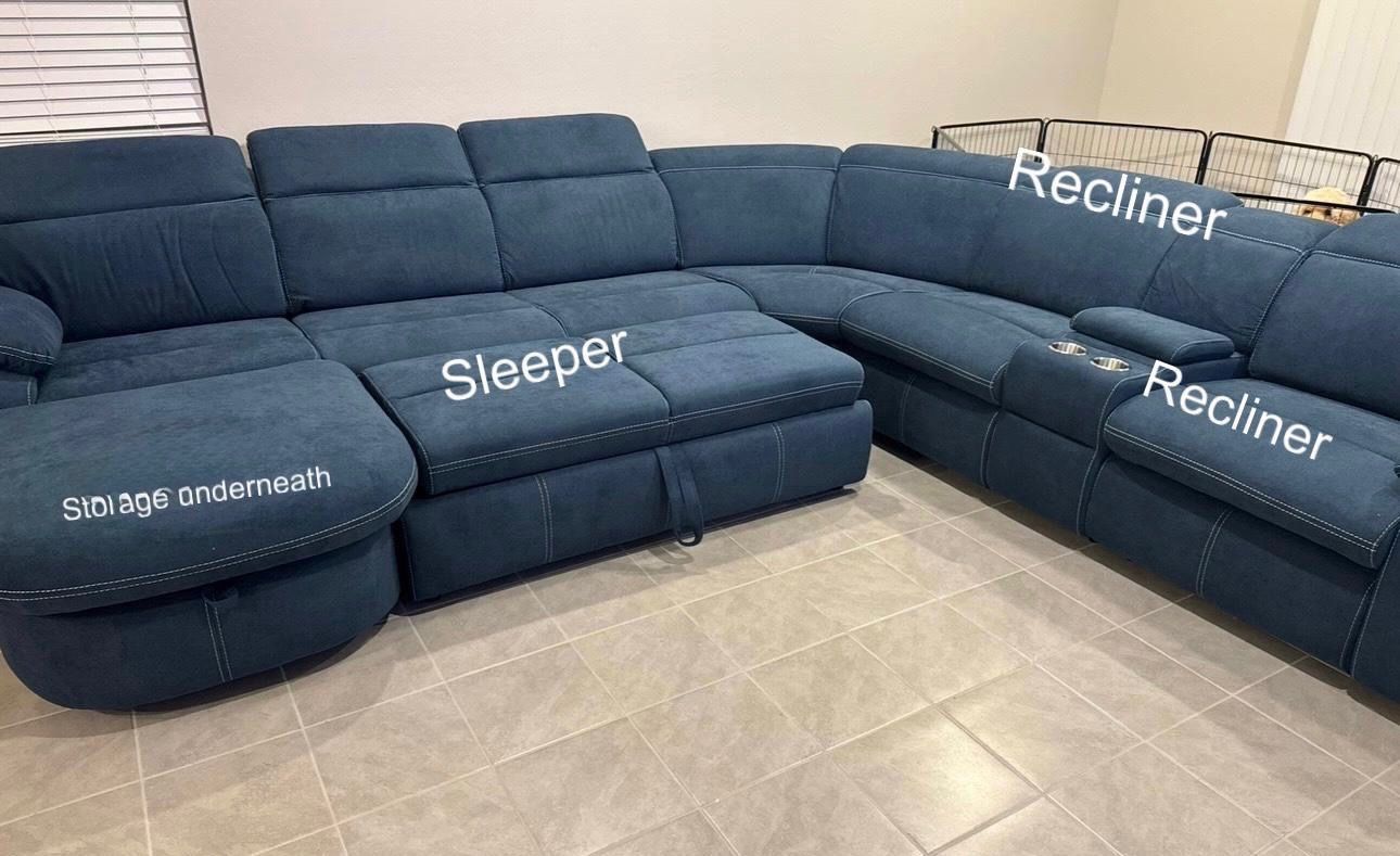 Selling my 4-piece oversized blue sectional that's only 1 year old and in excellent condition. It's extremely comfortable and perfect for large families, movie nights, or entertaining guests. This sectional has multiple premium features you don't usually find all in one couch: • 2 Power Reclining Seats • Power Chaise Back Recliners • Adjustable Headrests • Pull-Out Sleeper Bed for guests • Chaise with Hidden Storage • Cup Holders + Center Console Storage • All Power Reclining (NOT manual) • Very spacious and comfortable The couch is very large, so it's great for a big living room or family space. Condition: Excellent (well cared for) Pickup: Pick up only Transport: You will need a truck or U-Haul due to the size I'm downsizing and unfortunately cannot take it with me, otherwise I would keep it because it's such a beautiful and comfortable sectional. A Serious inquiries only. No lowball offers will be accepted. If the listing is up, it's still available. First come, first served.