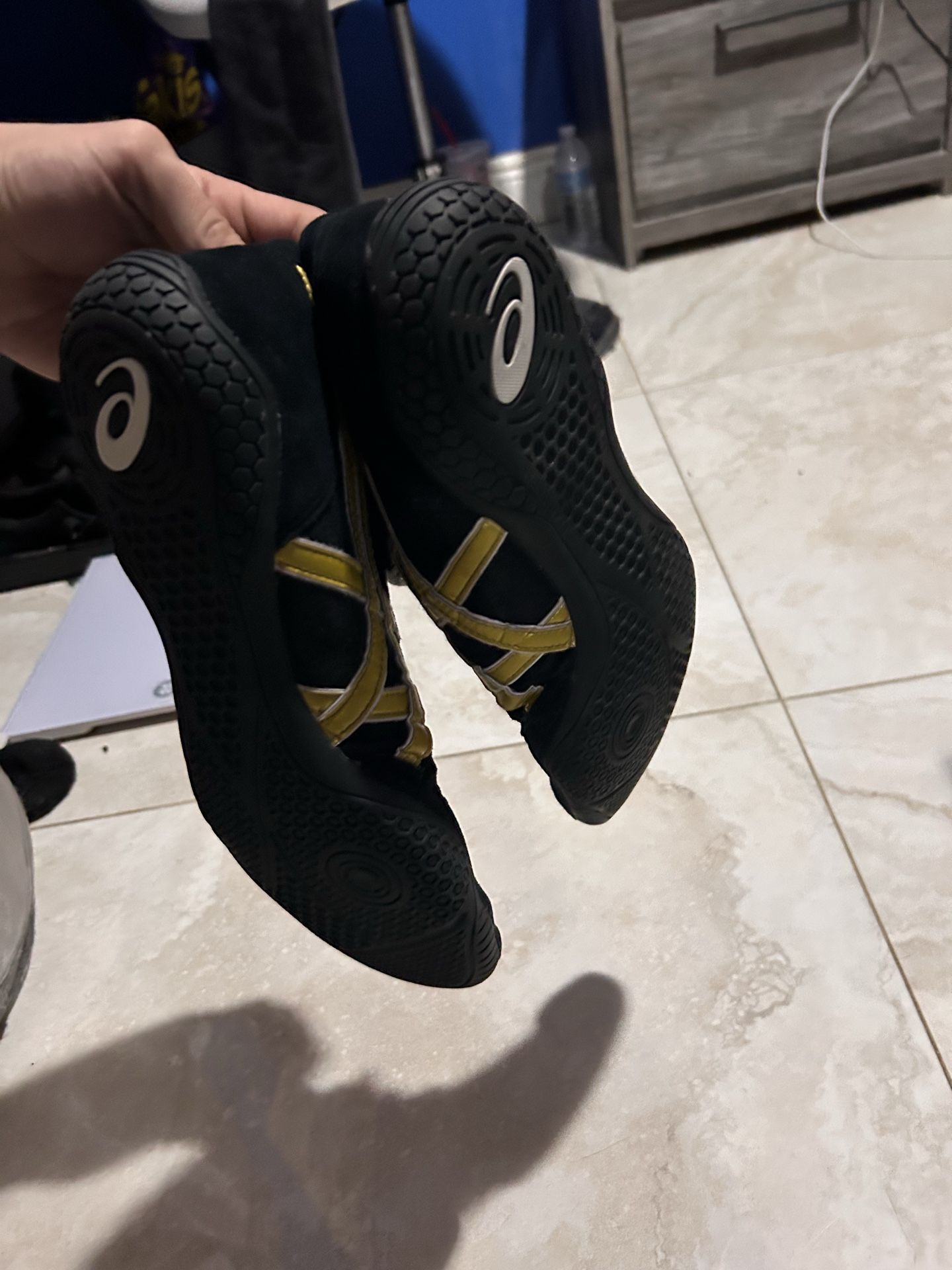 These black and gold footwear shown are ASICS EX-EO Wrestling/boxing Shoes only been worn 5 times.