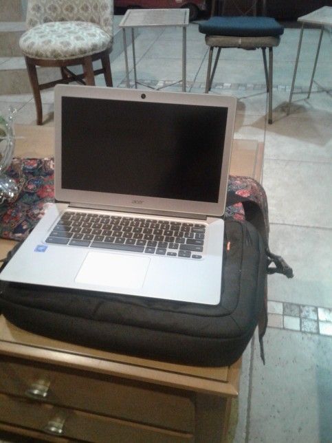 Acer Chromebook in good condition. There is a horizontal scuff/scratch on the screen that is barely noticeable, and is almost never noticeable when the screen is on. Includes charger and Amazon Basics laptop bag. 14 inch IPS screen 1.6-2.24 GHz quad core Intel Celeron processor 4gb RAM 32gb SSD HD webcam Ports: 3.5mm headphone jack, HDMI, 2× USB 3.1