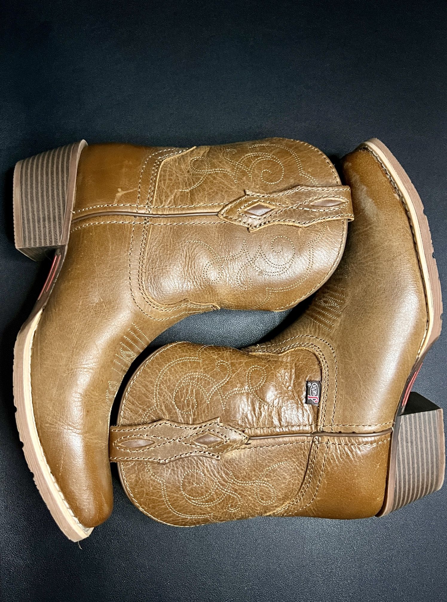 Boot was worn 3x, minor scuff marks. PRODUCT DETAILS Step into timeless Western style with the Justin Women's Chellie Western Booties - Square Toe. These booties blend rugged elegance with everyday comfort, making them the perfect addition to any wardrobe. Product Features: Durable Leather Construction: Crafted from high-quality leather, these booties ensure long-lasting wear and protection, perfect for an active lifestyle. Intricate Western Embroidery: The detailed stitching and unique patterns add a touch of authentic Western flair, showcasing traditional craftsmanship. Comfortable Fit: Featuring a cushioned insole and breathable lining, these booties promise all-day comfort and support, ideal for extended wear. Sturdy Rubber Outsole: The durable rubber outsole provides excellent grip and stability on various terrains, ensuring you stay sure-footed. Easy Pull-On Style: With side pull tabs, slipping into these booties is effortless, combining convenience with classic Western style. Whether you're on the ranch or in the city, the Justin Women's Chellie Western Booties - Square Toe deliver unmatched durability, style, and comfort in one classic package. Full-grain leather 7" shaft Square toe Fabric lining Cushioned footbed Rubber outsole 1 5/8" western heel Style: GY9510
