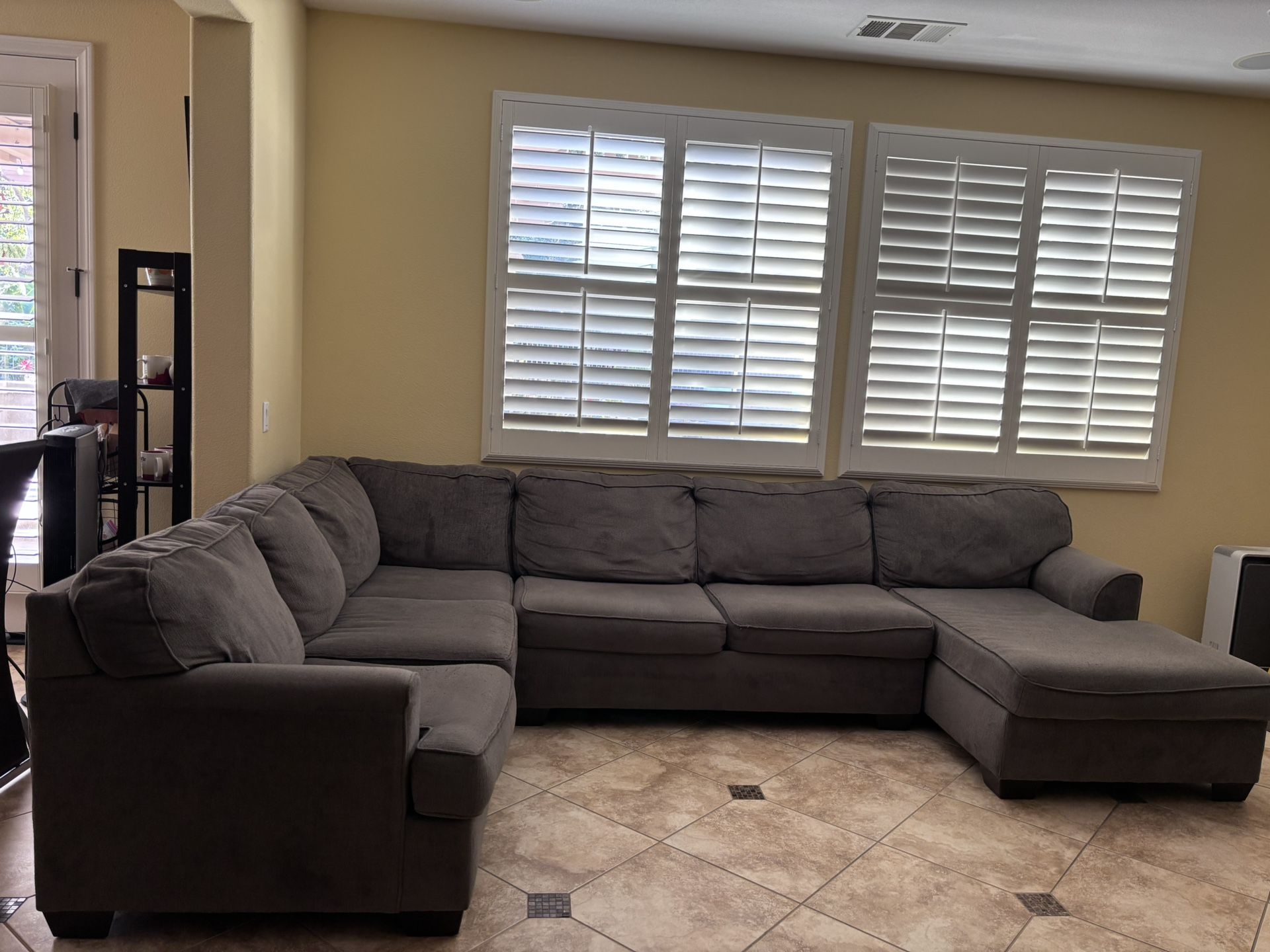 Dark gray fabric sofa couch from Living Spaces. Original price $1100. From a clean non-smoking, pet-free home. Pick up only. Measurements are: Width: 135” Depth: 89” Height: 35” Ashley Furniture, West Elm, Crate & Barrel, CB2, Z Gallerie