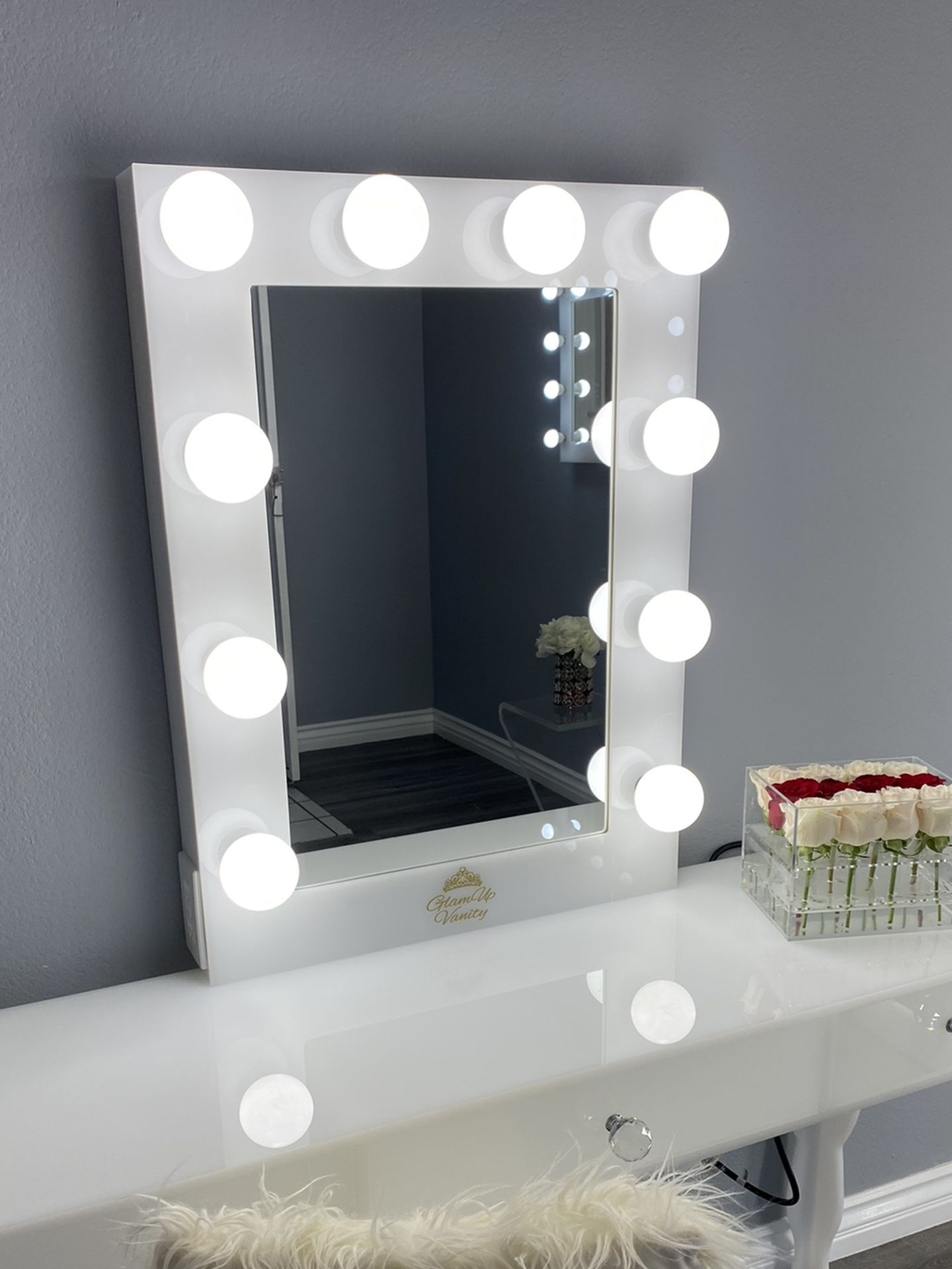 Vanity mirror made of Lucite Acrylic. Perfect for makeup application/Selfie. 🥰 •24x32 •10 LED light bulbs •Dimmer switch • USB connectors •Handmade in the USA We have our show room located in Santa Ana Ca. Were open by appointment only. *Price is for Vanity MIRROR ONLY!!!