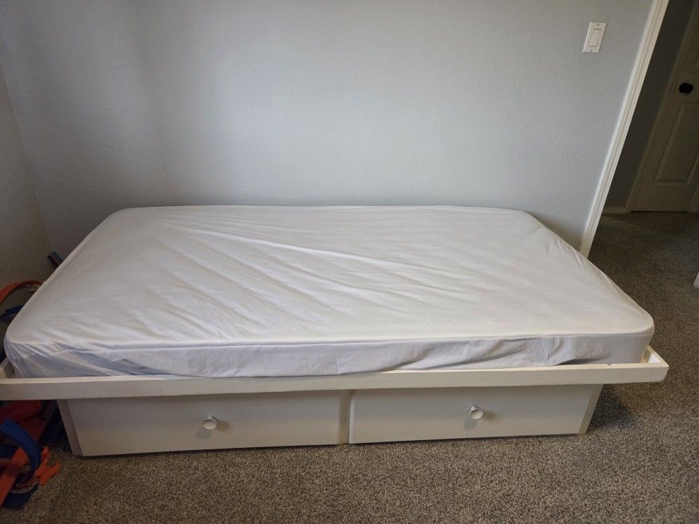 Solid, sturdy wooden platform bed, twin size with storage drawers underneath. Heavy! Very clean shoe free, smoke free, pet free home. Must pick up. Upstairs. Mattress, mattress cover and 2 blue twin sheet sets included.