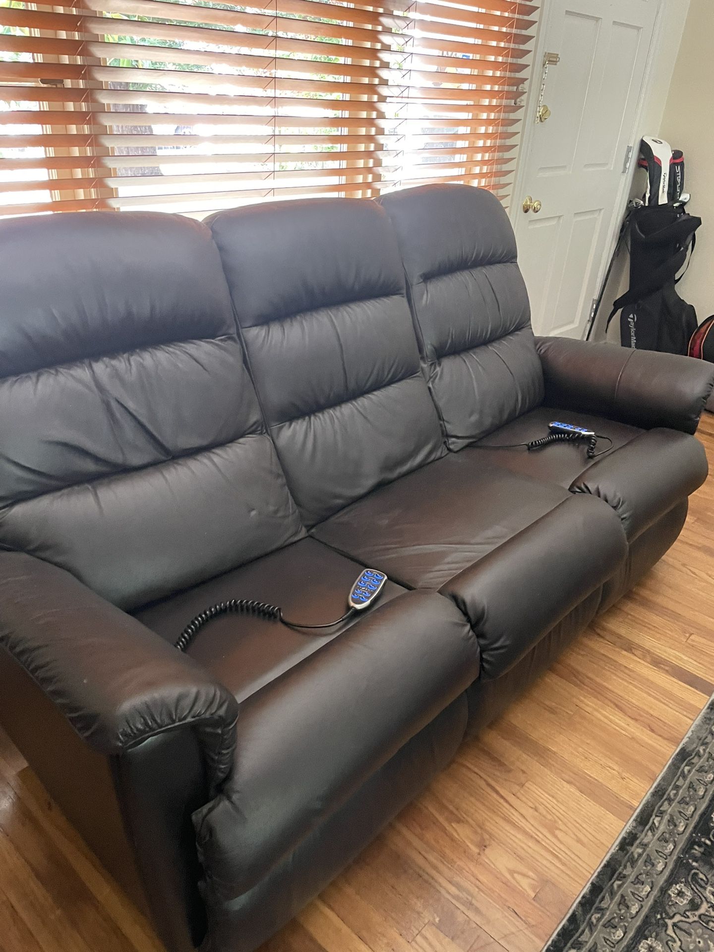 Excellent condition minus two corners on the back scuffed. (Pictured) Power recline w remote 84”x 42” x 64” reclined
