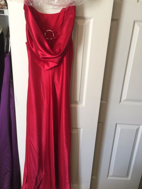 Long red dress , size 14W , round silver design on the back made by J R Nites.