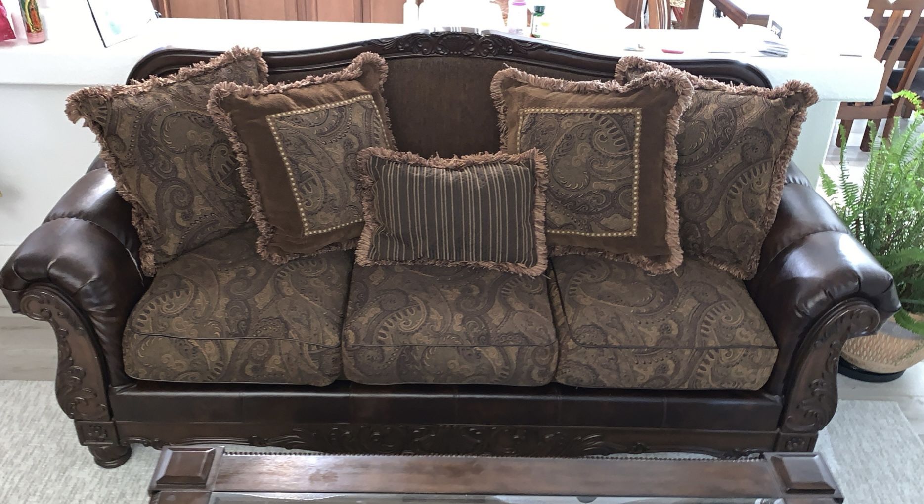 Beautiful, well-maintained sofas in excellent condition. • Rich dark wood accents and detailed carved trim • Comfortable seating with plush cushions • Elegant patterned upholstery with multiple matching throw pillows • No rips, tears, or major wear Perfect for a living room upgrade or anyone looking for durable, classic furniture.