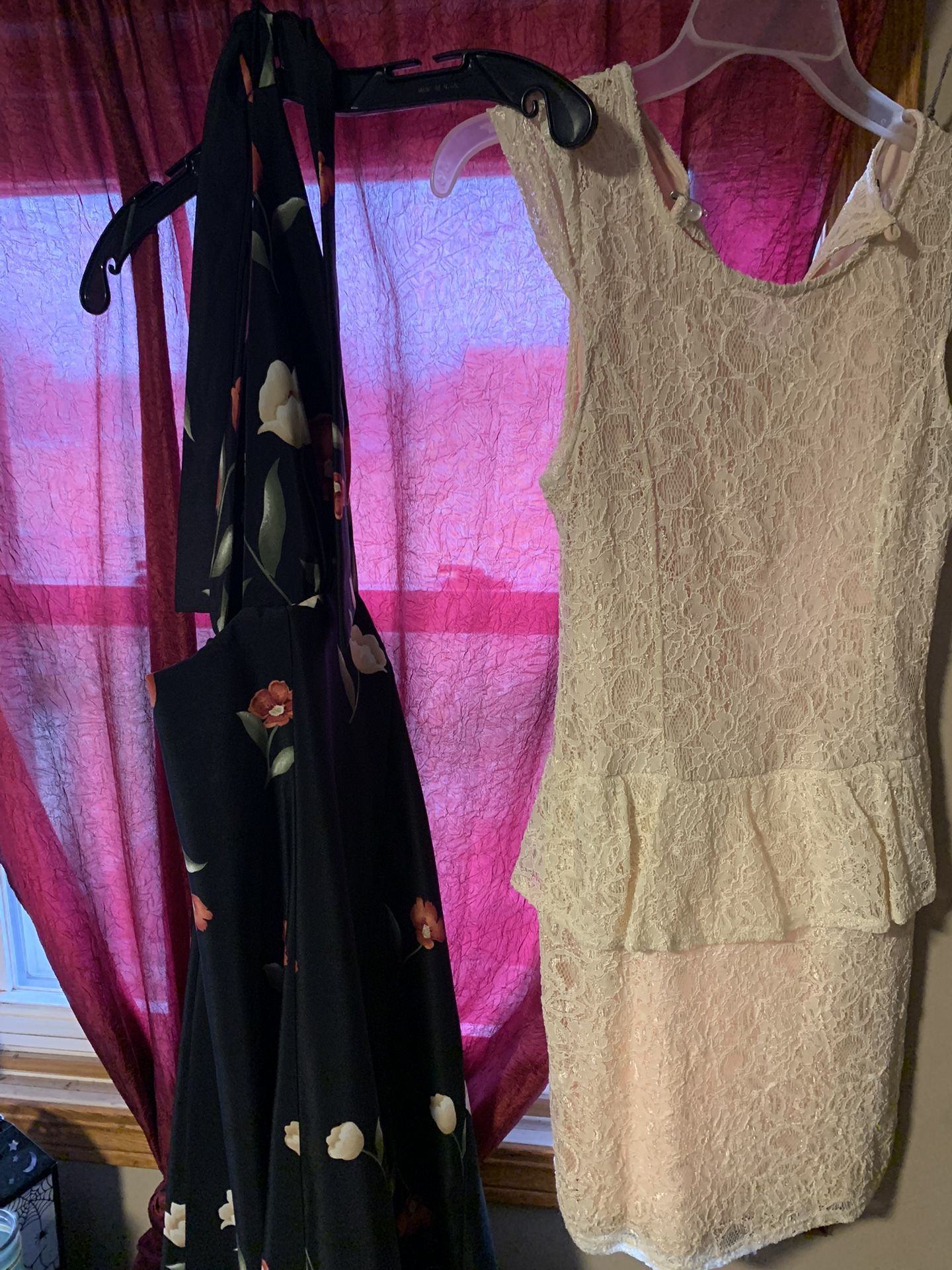 Black flowers dress hardly used small $5 dollars and short cream dress size medium hardly used.