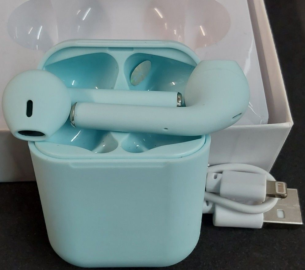 Bluetooth auto connect wireless Earbuds, easy to use, works with Android or iPhone. Color Powder Blue goes great with the correct outfit. Comes complete with charger. Opened one to Show