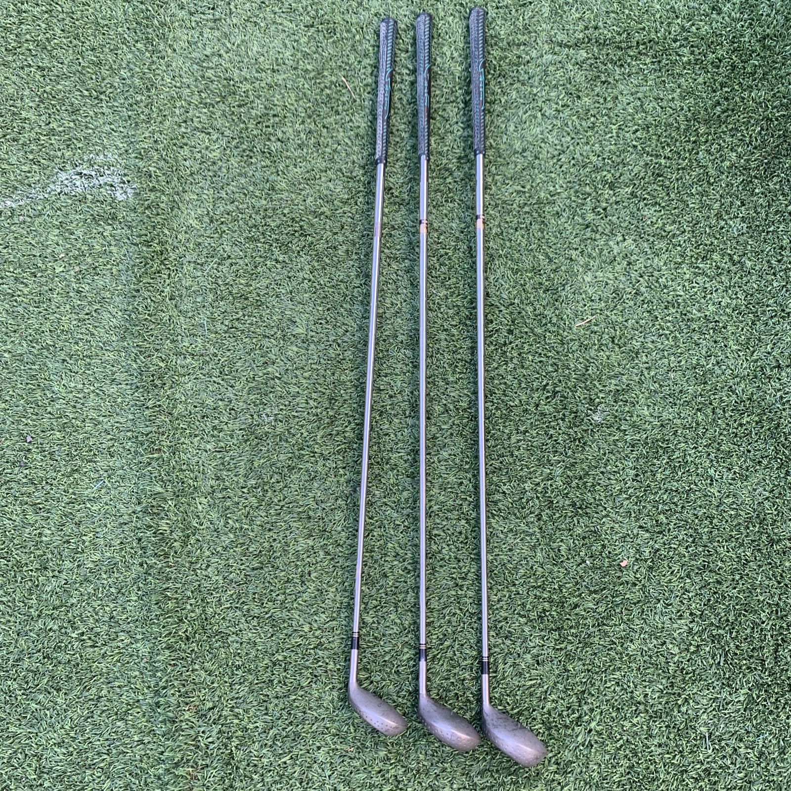 Used Condition. A number 1, 3, & 5 clubs. They all show wear. The rubber on the handle is cracked. The shaft has rust spots on it, and the head of the clubs have black scruff marks. Please review all pictures and let me know if you have any questions.