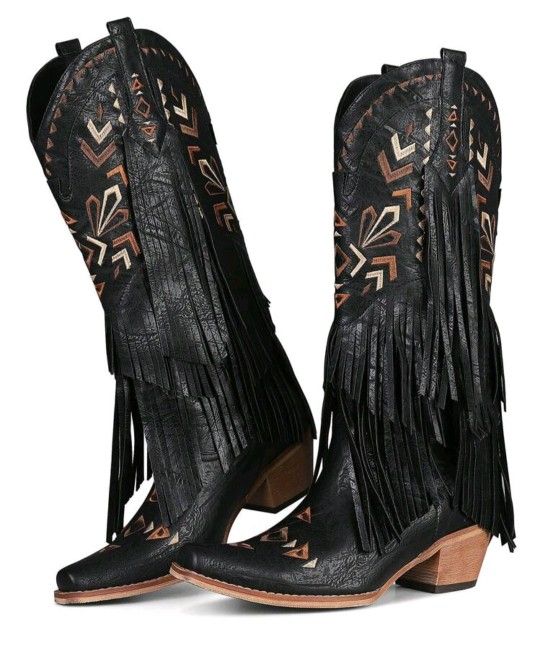 Black mid calf heeled tassle cowgirl boots. Never been worn.