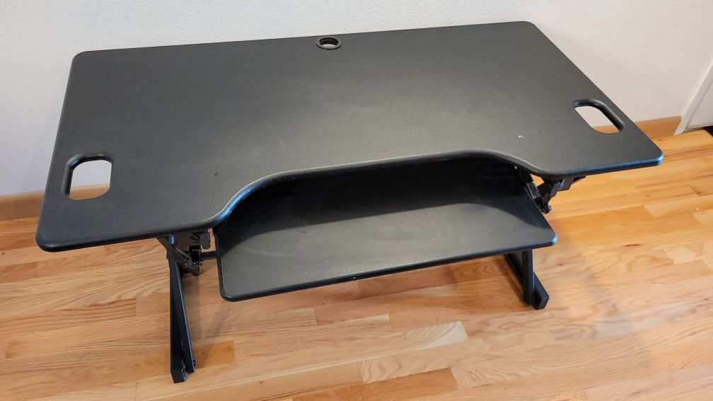 Rocelco 46" Large Height Adjustable Standing Desk Converter. This is in very good used condition and works perfectly. The desktop is 46"x23.5". It's large enough for 3 monitors. It goes up amd down using gas pistons. When down, it stands about 5" above the desk and the max height is 20" above the desk. Or you can set it anywhere in between. This model retails for $309 and is current on sale on Amazon for $283.