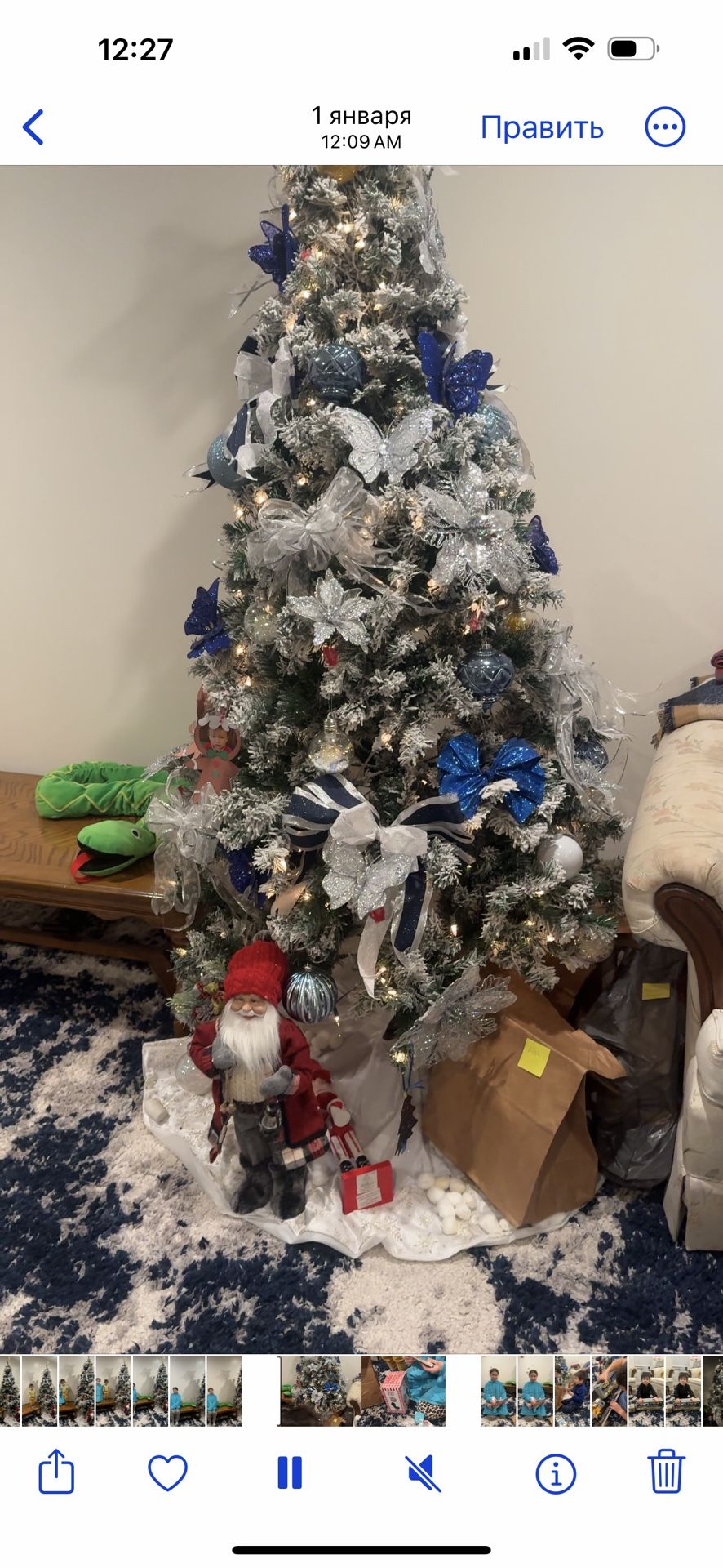 Artificial Christmas tree. Flocked branches. Pre-lit. Includes ornaments, skirt, ribbons and Santa figurine. Good condition.