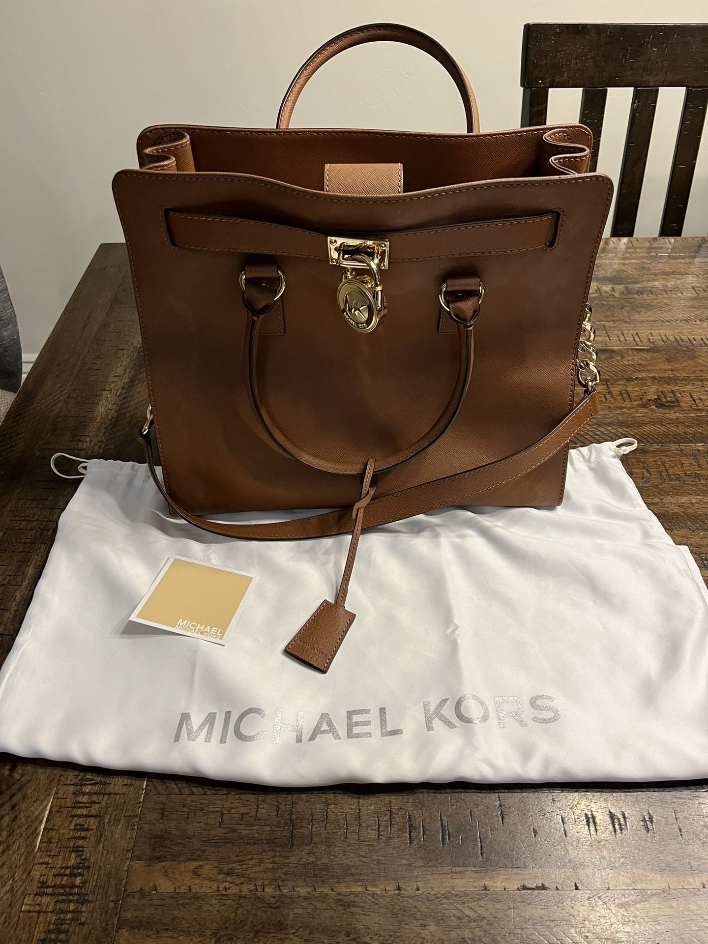 Authentic Michael Kors Hamilton Large Saffiano Leather Tote Bag in brown. Will include the Jet Set Large Saffiano Leather wallet. Both are in perfect condition with no rips or stains. They have just been in my closet.