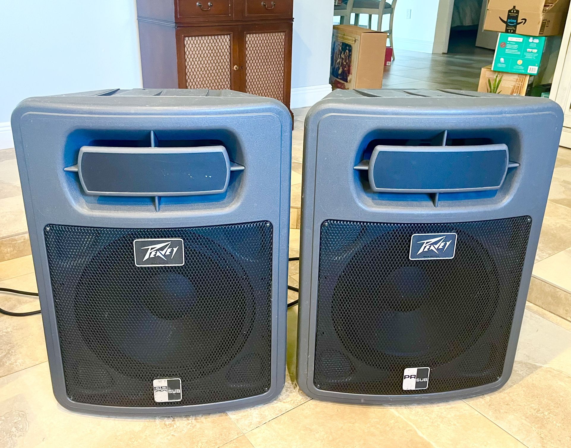 Selling my (2) pre-owned Peavey model: PR-Sub 15” speaker Passive Subwoofers In Good Working condition. 1/4” Jack inputs, 300 Watts RMS/600Watts Peak )These Speakers are lightweight, Portable and Have good Bass!! Come by and test/Hear before you buy! see pics for detail….. Frequency Response: 45Hz-3 KHz Dimensions: 28.562"X 21.312" X 17" Weight: 42lbs Each Key words: ADS Nakamichi Bowers & Wilkins Velodyne Nec Nad Onkyo FusionAV Integra Pioneer Elite Sony ES Technics Apogee JBL McIntosh Sonos Apple Airplay Audio streaming Bluetooth Network Audio QSC Clark-Technic electro-voice Behringer Yamaha Crown BSS Q-SYS peavey Dynacord Fu words: ADS Nakamichi Bowers & Wilkins Velodyne Nec Nad Onkyo FusionAV Integra Pioneer Elite Sony ES Technics Apogee JBL McIntosh Sonos Apple Airplay Audio streaming Bluetooth Network Audio QSC Clark-Technic electro-voice Behringer Yamaha Crown BSS Q-SYS peavey Dynacord Funktion one Adcom,Yamaha, Denon, Klipsch,Oppo,Sony, Krell, b & k, Pioneer, McIntosh, Marantz, Elite, Integra, Harman Kardon, Adcom. AR, Audiophile, Amplifier, Amps, Arcam, Acurus, Aragon , Adcom, Advent, Bose, Boston, Beovox, Bryston, Bedini, B&K, B&0, Bangs&Olufson, B&W, Bowers & Wilkins, Celestion, Counter Point ,Classe, Classic, Canton, Cello, Creek, Cerwin Vega, Dahlquist, Denon, Dcm, Dynaco, Dynaudio, Ess, Spica, Spicure, Ensemble, Electrostatic, Elite, Fosgate, Harman kardon , Harbeth , Integra, Infinity, JBL, Jardis, Jolida, Linn, Luxman,KEF, Klipsch , KLH, Krell, Kenwood, Martin Logan, McIntosh, Mirage, Mission, Monitor Audio, Nad , Onkyo , Paradigm, Proac, Sony, Pioneer, Polk-Audio, Preamplifier, Quad ,Rogers, Rotel, Rega, Stanton, Speakers, Sony, Studio, Vandersteen,, Snell, Spendor, Thorens, Vandersteen, Wharfedale, Yamaha, Speakers, Home Theater, Audiophile, M&K, B&W, Bowers & Wilkins, Infinity, Accuphase, Canton, Boston Acoustics, Linn, McIntosh, Paradigm, Dali, Wilson Audio, Sonus Faber, KEF, Definitive Technology, PSB, NHT, JBL, Magnepan, Eminent Technology, Monitor Audio, Vienna Acoustic, Meridian, Behringer, Martin Logan, Acoustat, Quad, Genesis, Opera, Mirage, Energy, Pinnacle, JBL, Celestion, Spica, Aragon, Onkyo, Infinity, Martin Logan, Klipsch, Musical Fidelity, Sonic Frontiers, Cambridge Audio, Sunfire, Velodyne, SVS, HSU Research, Audio Research, Onkyo, Yamaha, Sony, Denon, Marantz, Pioneer, Tannoy, Bose, Eltax, Subwoofer, Omnipolar, Home Theater. 5.1, 7.1, 9.1, THX, True HD Master, 3D, Bluray, DVD, LED, LCD, Cinema, McCormack, Conrad Johnson, RSL, Classe, Parasound, Magneplanar, Audible Illussions, McIntosh, Mark Levinson, Vintage, Omega electronic, electronics, home theater, surround, surroundsound, surround sound mixing, dj, dee jay, dee jay equipment, custom, party, parties, theater, Hi-end, Vintage, AR, Audiophile, Amplifier, Amps, Arcam,