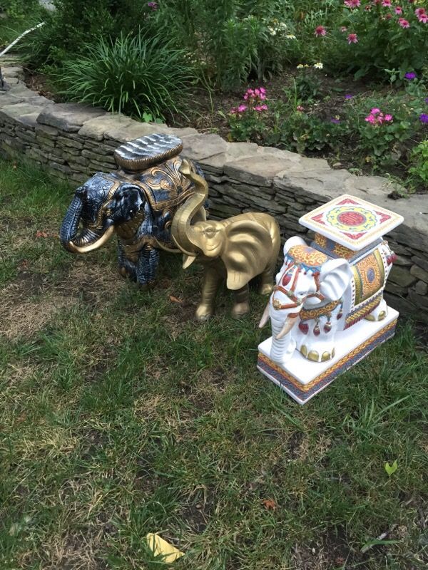 Brass elephant 300 White elephant see crack in nose $150 Black and gold elephant 125