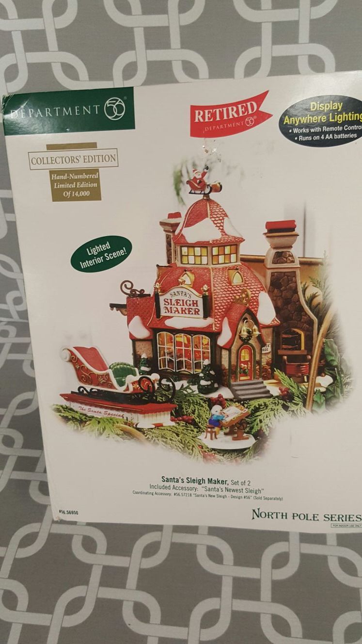 Santa's Sleigh Maker" Dept. 56 North Pole Item. It's the lighted building only (no sleigh). Introduced in 2006 and retired 2007. Lighted Interior Scene. Display Anywhere Lighting™, 4 AA Batteries. Good condition in original box & sleeve. Size: 8 x 6 x 7", 3.5 x 2.25 x 2.5". Great for whimsical part of your Christmas collection!