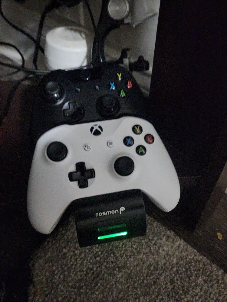 XBOX 360, 2 CONTROLLERS WITH WIRELESS CHARGER AND A10 HEADPHONES