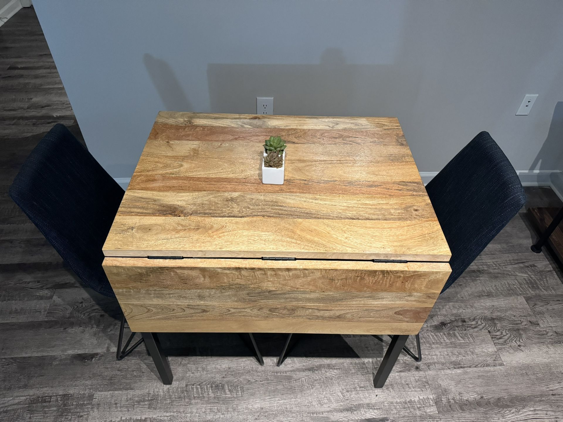 Box Frame Drop Leaf Expandable Table (24"–48"). Come with 2 chairs.