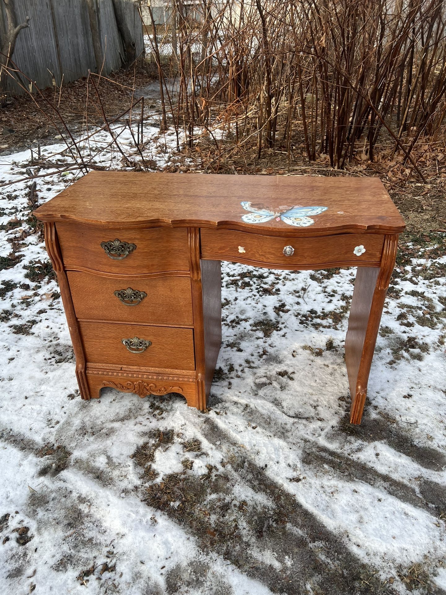 DIY/refinishers dream. Solid and sturdy. All drawers open and close very smooth. Stickers needs to be removed and has some bumps and bruises but is overall in great shape. Dimensions are 42”x20”x30”H