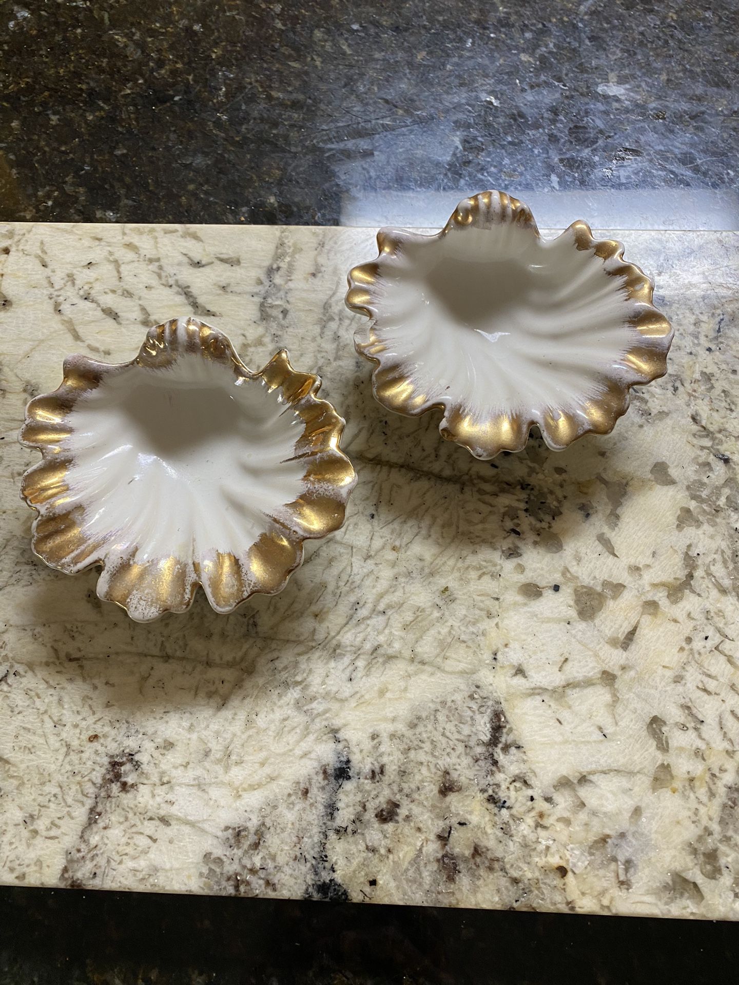 This pair of Vintage Porcelain Shells have been in the Family for more than 60 Yrs. My Mom kept one in her bathroom and the other on the dresser. . Measures 5”x2” Footed trimmed in gold. Goes with decor. One tiny chip on top of rim see last picture PRICE IS NEGOTIABLE PICK UP IN HOLLYWOOD