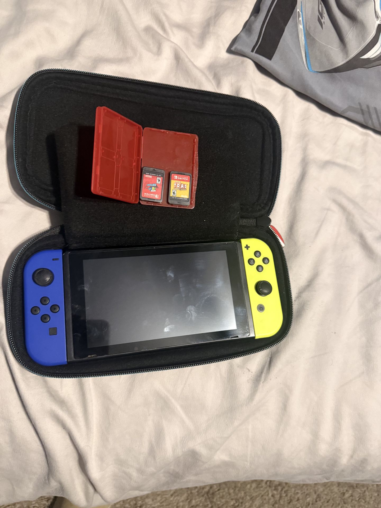 Nintendo Switch for sale 🎮 Good condition Nintendo Switch with blue and neon yellow Joy-Cons. Works perfectly with no issues. Comes with: • Nintendo Switch console • Donkey Kong carrying case • 2 games: Super Mario Party and Captain Toad Treasure Tracker • Game cartridge holder Everything works great. Perfect for gaming at home or on the go. Price: $191 Pickup in Houston.