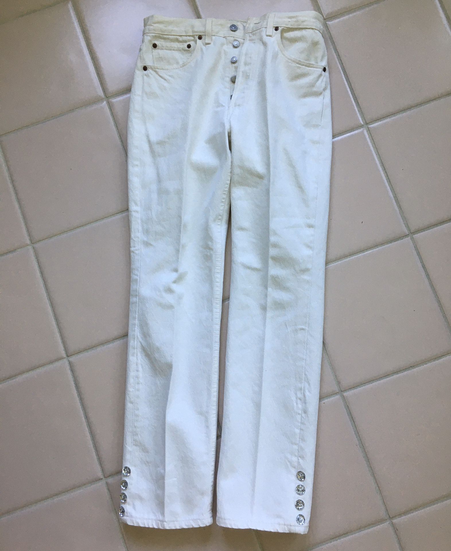 Levi’s White designer Jeans - “Next to NEW”, Super-clean and No wear - Style: Lean unisex, Straight Leg, with button fly - Size: 32” Waist x 34” Length - Material: 100% real Cotton denim - FYI: “I can easily remove the four designer buttons near each cuff, if you prefer not to have them.” No problem. - Making room. Must let them go. - Freshly “washed & cleaned” - Why pay up to $69.99 from a retail store? Asking price is OBO.
