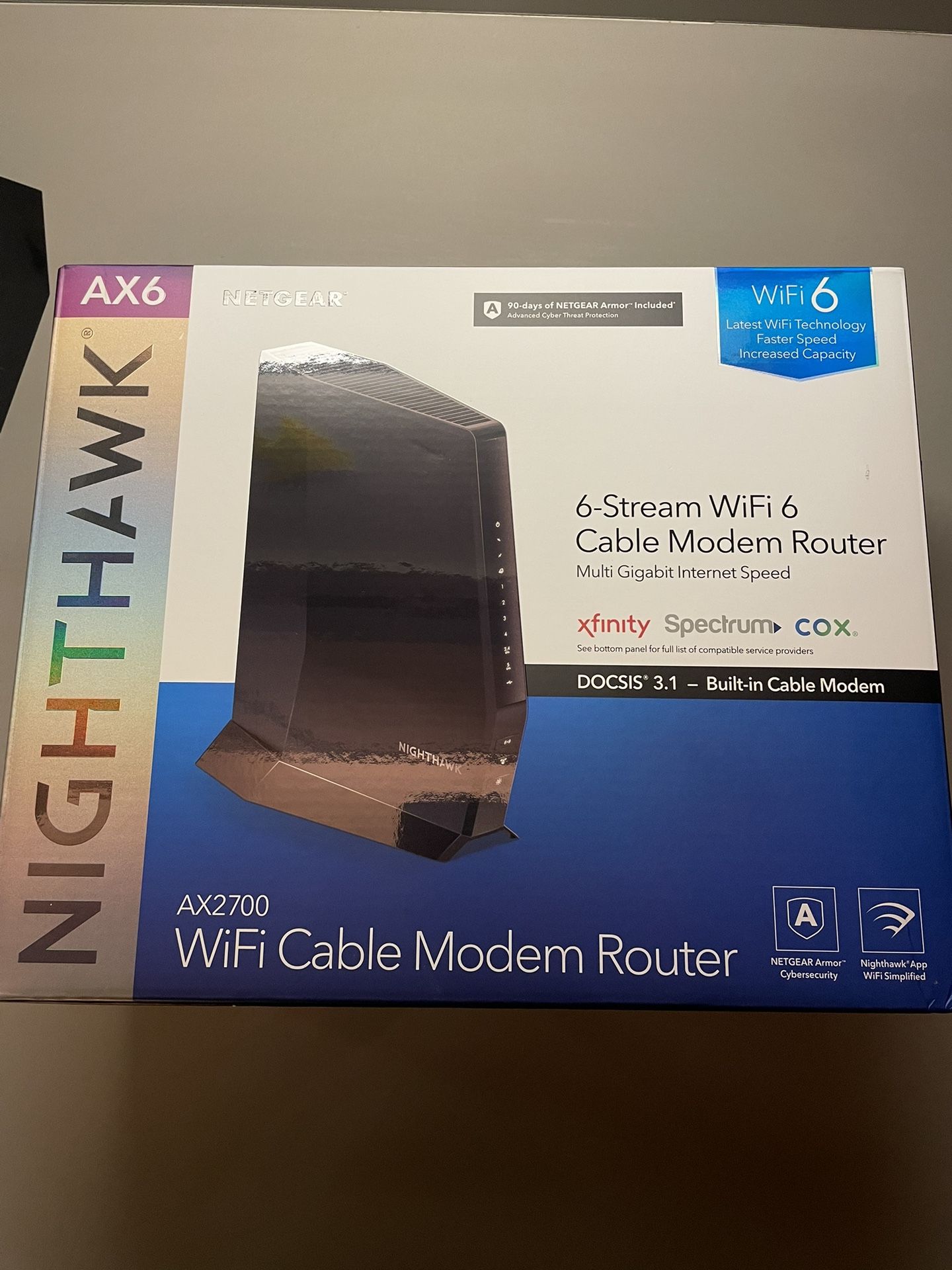 Nighthawk AX6/6 stream WiFi 6 cable modem router. Includes modem router and power adapter. Only used for a couple months. I switched over to a different internet provider and no longer need this. Still works like new! Asking $325, OBO.