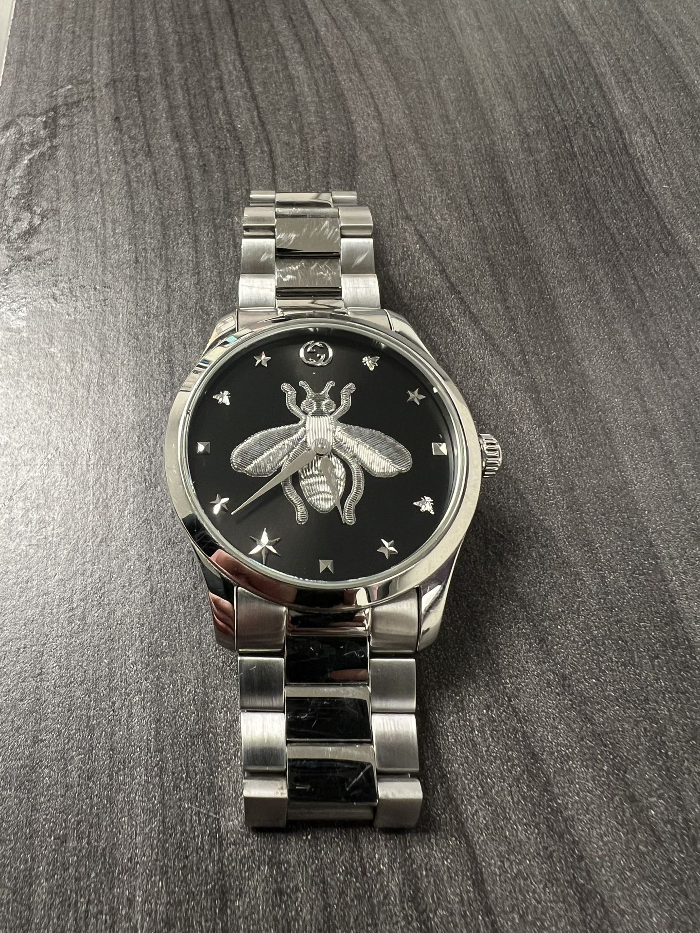 My watch has mainly sat in storage, have worn it out approximately 10-15 times over the last 4 years. So it shouldn’t have too much wear and tear on it at all. Just looking for some extra cash! Key Identifiers: • Dial: Black with a large, textured silver bee at the center, surrounded by smaller bees and stars as hour markers. • Brand Logo: Interlocking “GG” at 12 o’clock. • Hands: Slim silver dauphine-style hands (no seconds hand visible — typical for this model). • Case & Bracelet: Polished stainless steel, 38mm case, integrated metal bracelet. • Movement: Swiss automatic (visible through a display case back, though not shown here). Notes: • The bee is a signature Gucci symbol, often used in their jewelry and watch lines. • This model is part of the G-Timeless collection, blending fashion and fine watchmaking. • Retail price typically ranges from $1,400–$1,800 USD, depending on the exact configuration.