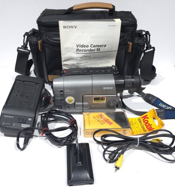 Pre-owned in good condition and fully functional. This camera comes with a carrying case, instructions manual, the battery charger/wired battery pack, a brand new 8mm cassette tape and the audio/video component cable to hook it up to your TV. See pictures for a detailed look. Available for pickup in the city of Stanton close to the Stanton Central park. Message me if you want to come by. Please Note: This camera only plays and records in Video8 format so if you are buying this to play old tapes make sure they were recorded in Video8 format. 8mm tapes can be recorded in 3 different formats (Video8, Hi8, and Digital8) with different Handycams so they are not all recorded the same.