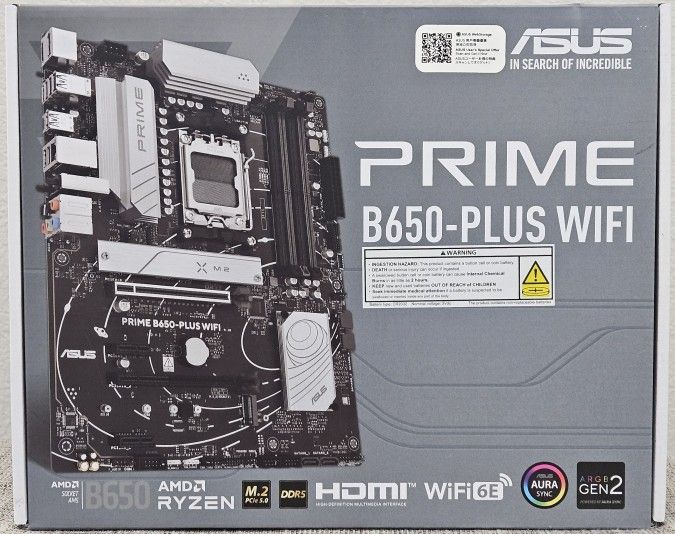 ASUS Prime B650-Plus WIFI $150 BRAND NEW, STILL SEALED • CPU: AMD Socket AM5 for AMD Ryzen 9000, 8000, 7000 Series Desktop Processors • Chipset: AMD B650 Chipset • Memory: 4 x DIMM, Max. 192GB, DDR5 7600+ • Graphics: 1 x DisplayPort, 1 x HDMI port • Expansion Slots: AMD Ryzen 9000, 7000, 8000 Series Desktop Processors, B650 Chipset • Storage: Total supports 2 x M.2 slots and 4 x SATA 6Gb/s ports • Ethernet: 1 x Realtek 2.5Gb Ethernet Wireless & Bluetooth: Wi-Fi 6E; 2x2 Wi-Fi 6E (802.11ax); Bluetooth v5.3 • USB: Rear USB (Total 8 ports), Front USB (Total 7 ports) • Audio: Realtek 7.1 Surround Sound High Definition Audio CODEC • Special Features: ASUS 5X PROTECTION III, ASUS Q-Design, ASUS Thermal Solution, ASUS EZ DIY, Aura Sync • BIOS: 256 Mb Flash ROM, UEFI AMI BIOS • OS: Windows 11, Windows 10 64-bit • Form Factor: ATX Form Factor; 12” x 9.6”