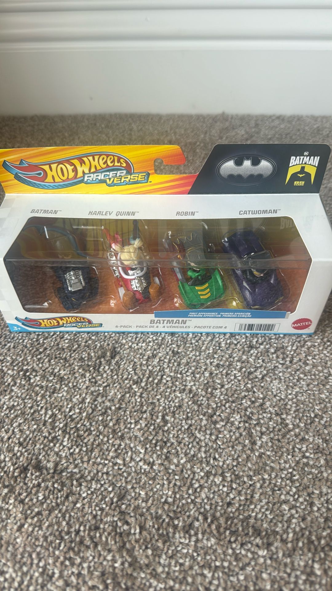 Brand new 4 pack Hot Wheels Racer Verse Batman series that comes with Batman, Harley Quinn, Robin and Catwoman. Begin your holiday shopping now!