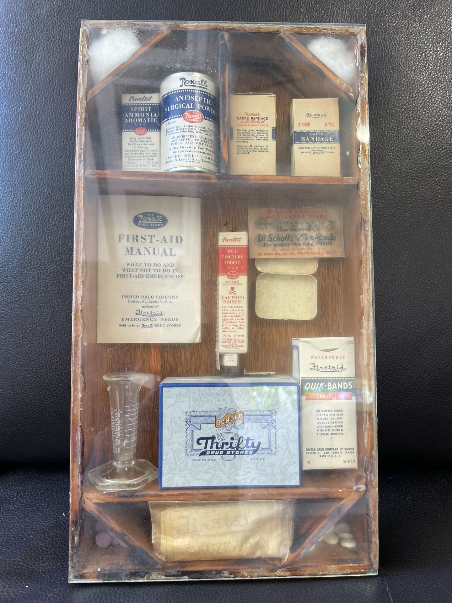 Original Rexall / Thrifty Drug Store first-aid kit, likely 1940s. Still sealed behind glass with original contents β antiseptic powder, bandages, Soovain tin, and more. A genuine piece of vintage pharmacy history! π Dimensions: 14ΒΌβ x 7ΒΎβ x 1ΒΎβ π° $95 π Located in Bonita Condition consistent with age. Great wall display or collector piece!