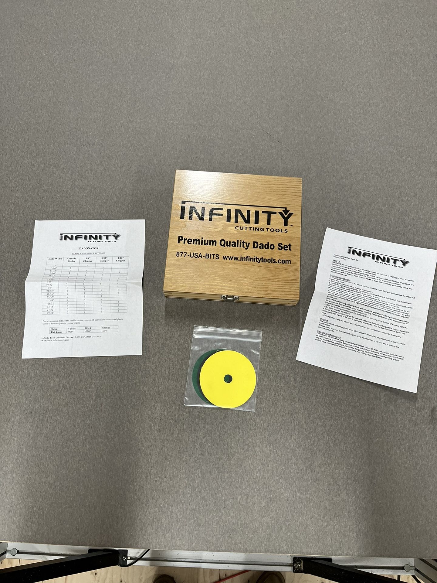 No trades Cash only For your consideration a new, unused Infinity Tools Dadonator blade set. Includes everything seen in the pictures. (Description from website) World's Only 8" Dado Saw Blade Set With 6-Tooth Chipper Design & 24-Tooth Outside Blades! The 8" Dadonator is the finest 8" cutting stacked dado saw blade sets on the market. The Dadonator produces virtually polished, absolutely square, flat bottom dados, even in the most difficult materials. This superior performance is the result of our unique 6-tooth chipper design, high ATB (Alternate Top Bevel) grind, negative hook angle, premium materials and detailed craftsmanship. The Dadonator™ includes a total of eight saw blades, two outside saw blades and (six) 6-tooth chippers. The chippers come in three sizes; 1/8", 1/16" and 3/32" thickness. The 3/32" kerf chipper allows you to adjust the cutting width to give a snug fit when making undersized plywood dado cuts. Each premium blade body is given our exclusive Chrome Armor coating for extreme resistance to rust and pitting. The Chrome Armor coating also allows the blade to resist resin and pitch build-up and makes blade clean-up a snap. Each set also includes our 6-Pc. color-coded dado shim set to allow you to quickly make micro-adjustments to your stacked dado set. Cut from a tough plastic guaranteed to never tear or rip during normal operation, they are 4" in diameter and have a 5/8" bore. Please Note: Max safe operating speed is 7000 rpm.