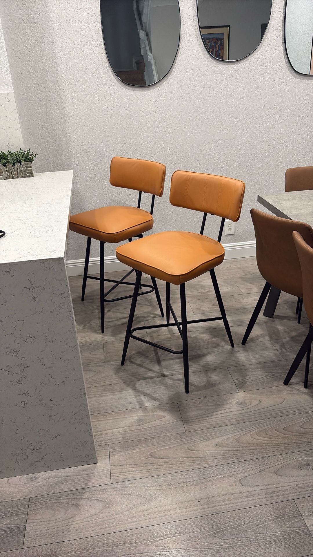 Natural burnt orange swivel bar stools. Comes with two. In box never opened, assembly required.